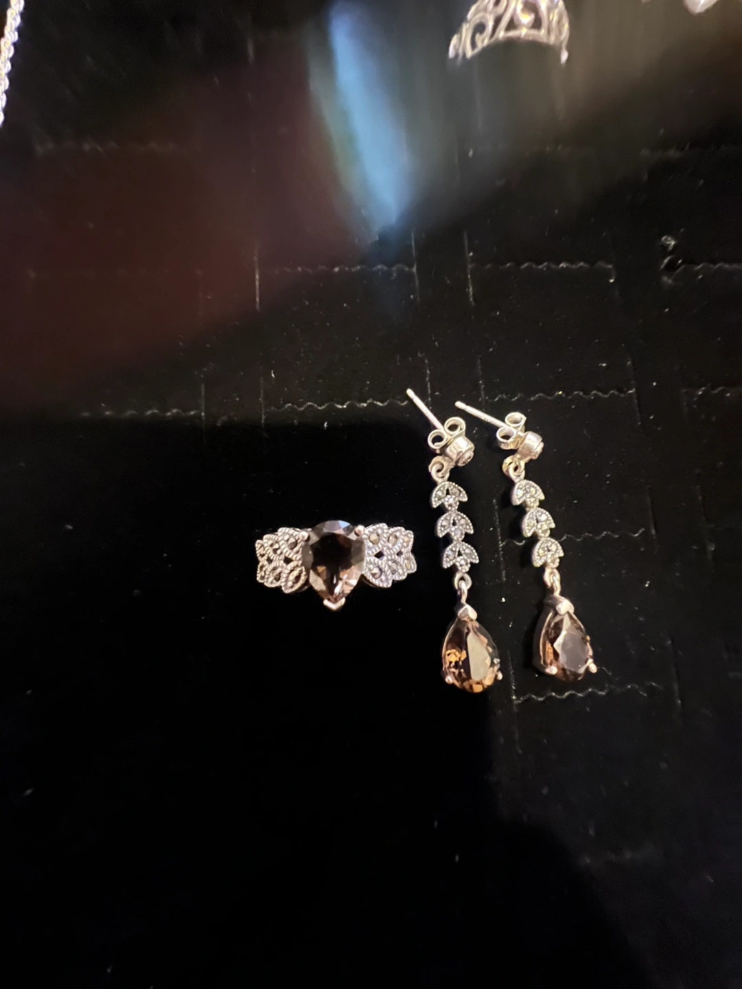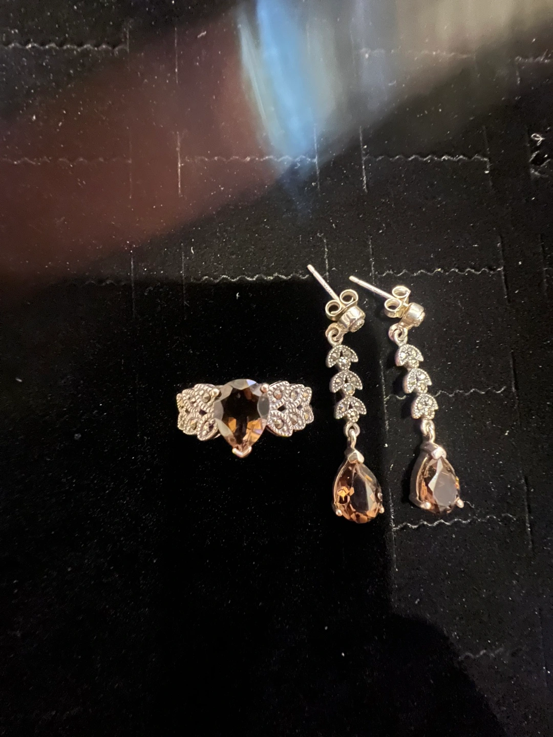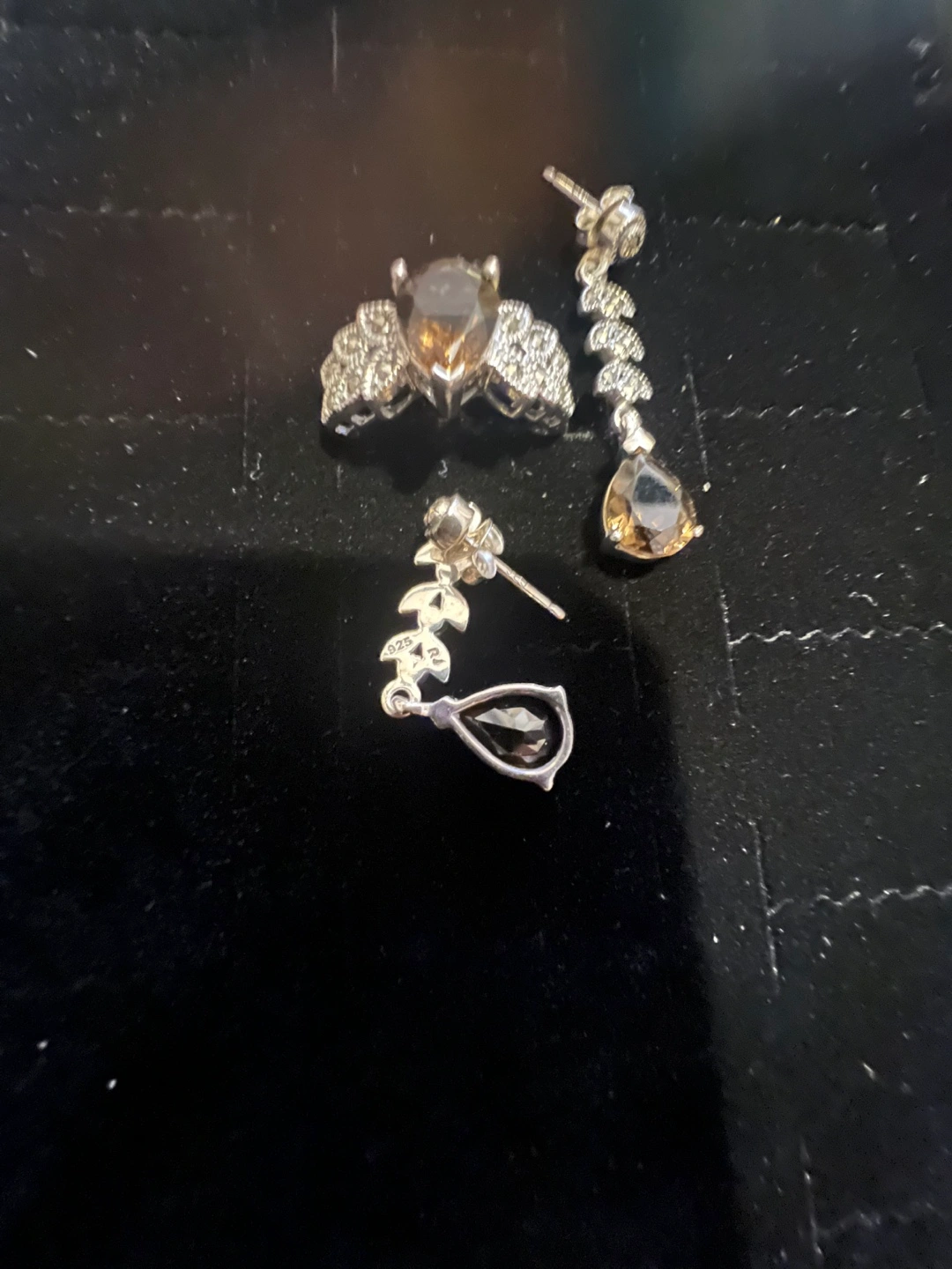This elegant set features a sterling silver ring and matching dangle earrings, each adorned with pear-shaped smoky quartz stones. The ring's band is intricately detailed with smaller stones. Sterling silver construction.