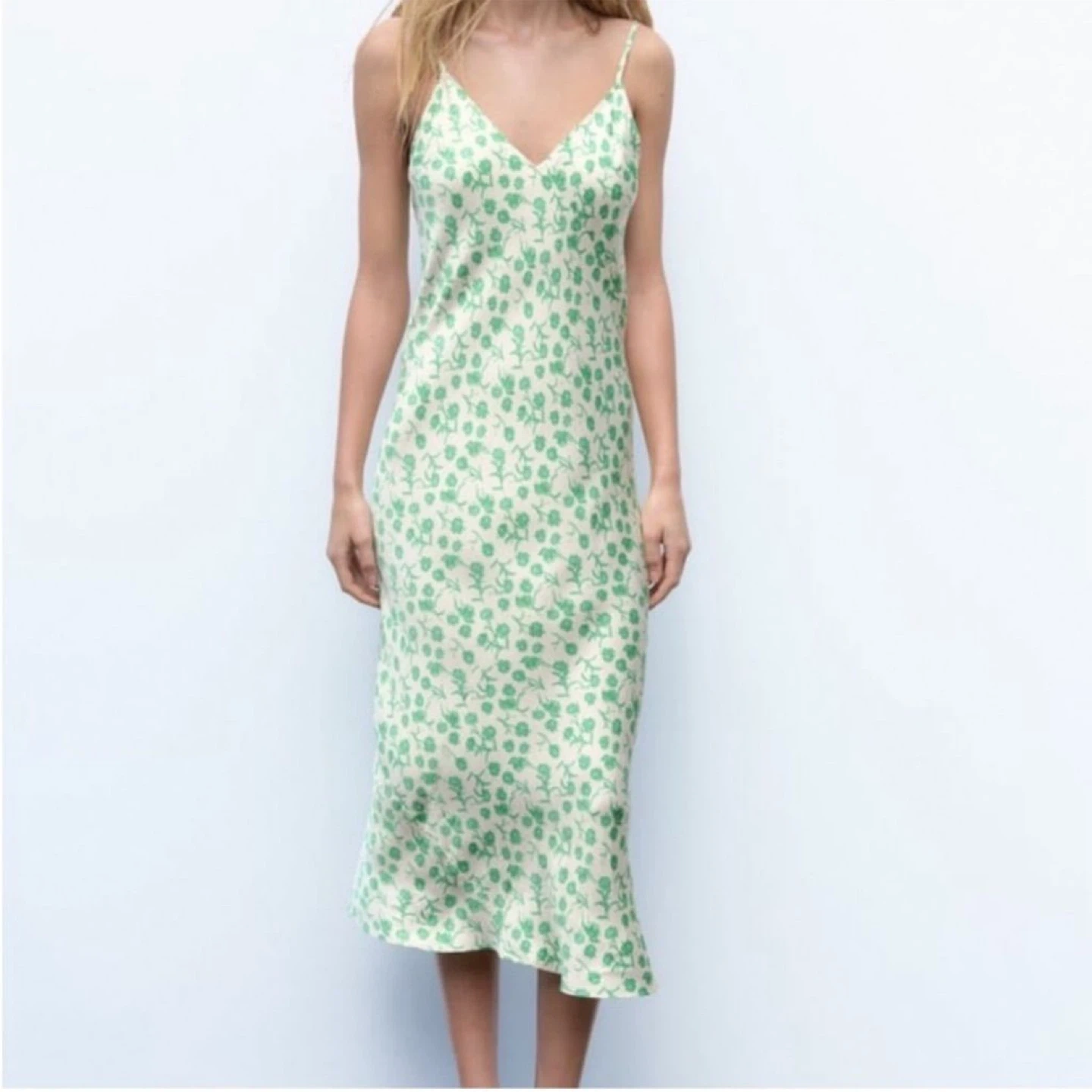 This is a cream midi slip dress with a green floral print. It features a V-neckline and adjustable spaghetti straps. The fabric is lightweight, making it perfect for warmer weather.