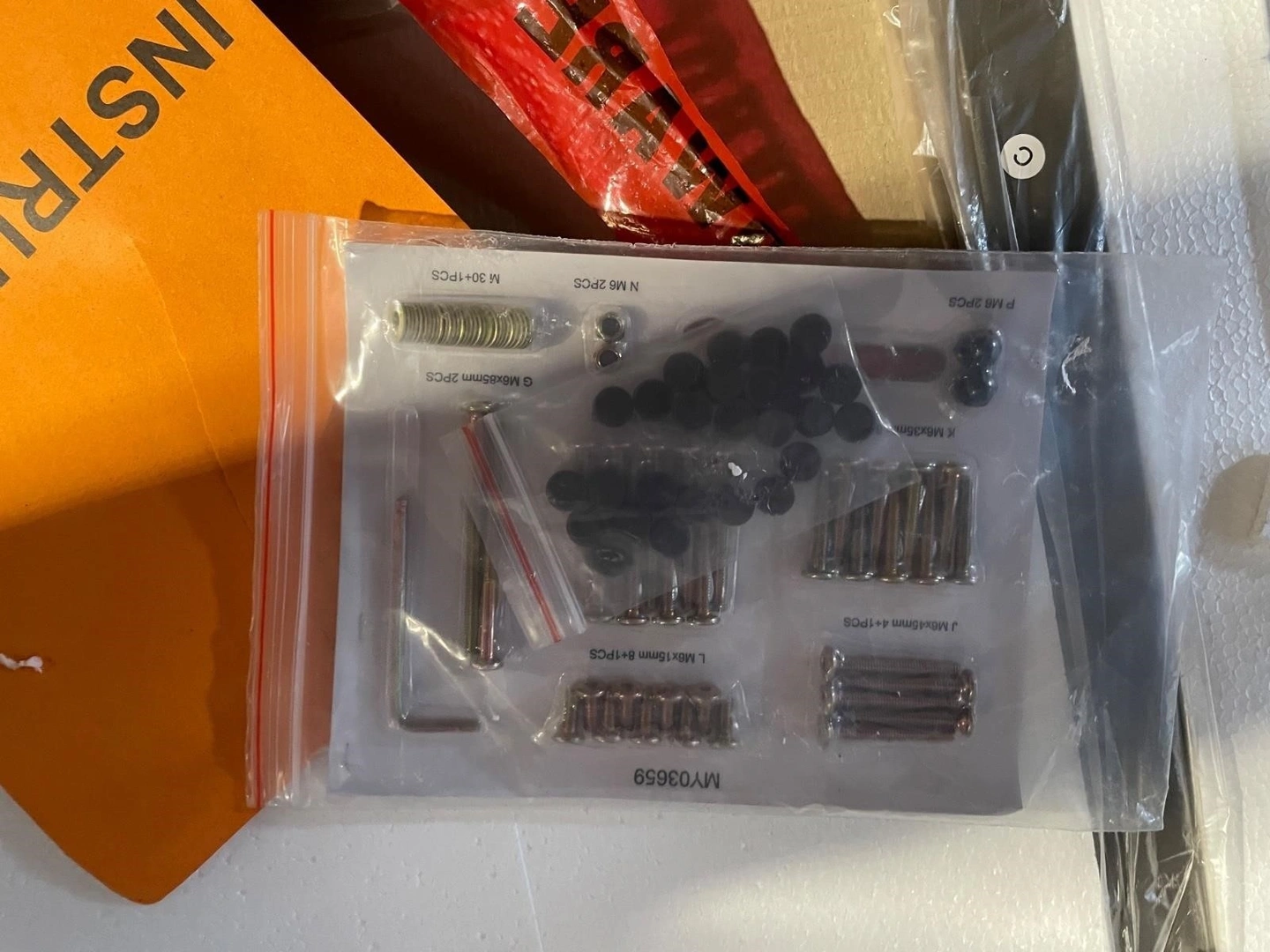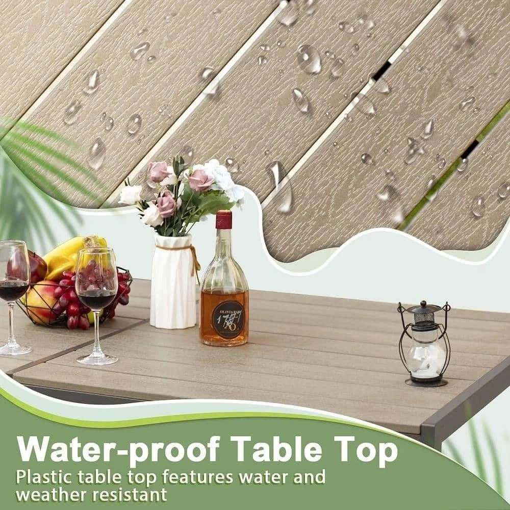 Selling a brand new patio dining table! The plastic table top features water and weather resistance, perfect for outdoor use. Assembly instructions are included, along with all the necessary components like screws and other hardware. Enjoy your outdoor dining experience with this durable and stylish table