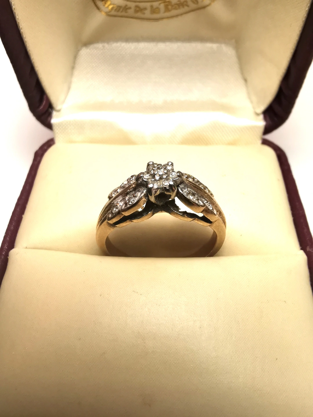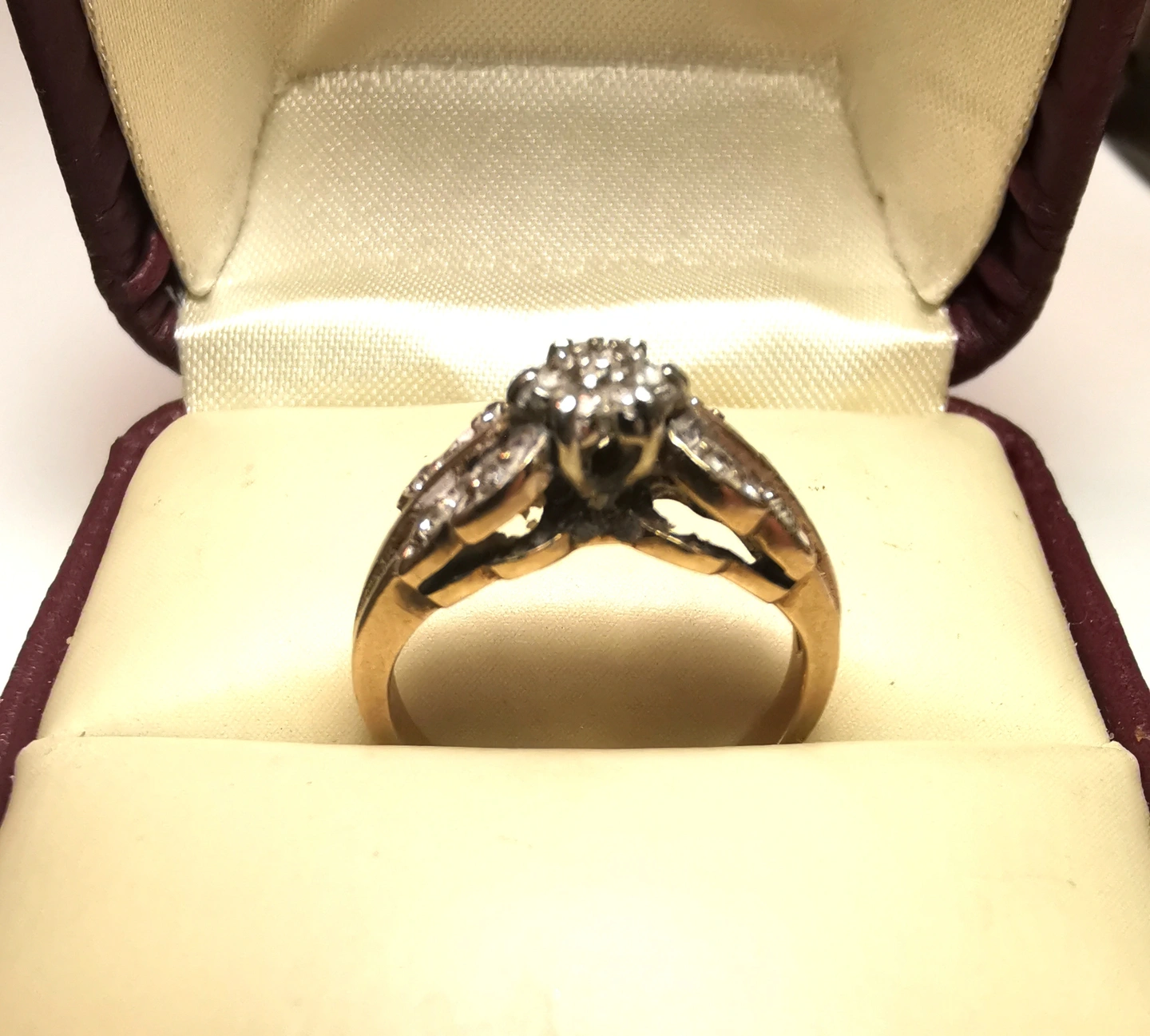 A stunning, solid 10K yellow gold vintage ring from the renowned Canadian jeweler Charm Diamond Centres. This piece features a classic 1980s multi-diamond cluster set in a white gold illusion plate to maximize light reflection. The band is exceptionally sturdy, weighing a substantial 3 grams, and features elegant textured leaf bypass shoulders.