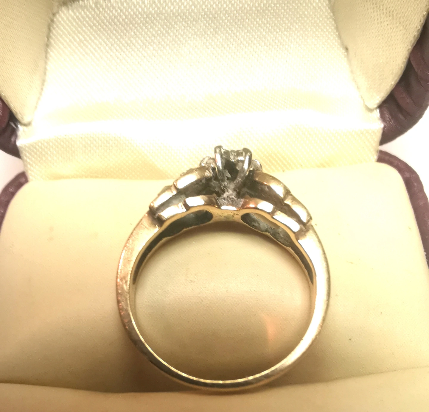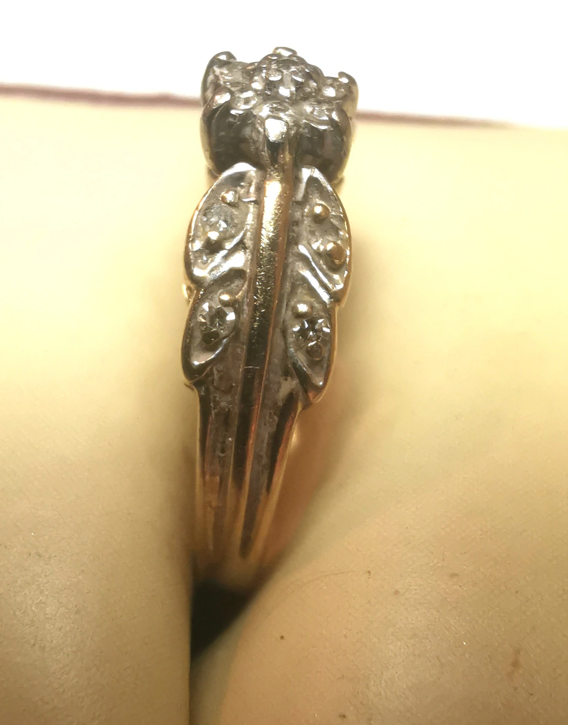 Details: Because of the 3-gram weight, the band (shank) is very thick and has not thinned over time. There are no signs of previous resizing or repair. The diamonds are bright, clear, and firmly set. Light surface polish marks only; no deep scratches or dents. Because of the 3-gram weight, the band (shank) is very thick and has not thinned over time. There are no signs of previous resizing or repair. The diamonds are bright, clear, and firmly set. Light surface polish marks only; no deep scratches or dents. Good vintage condition with light wear please reveiw photos as they are part of the description of the item.