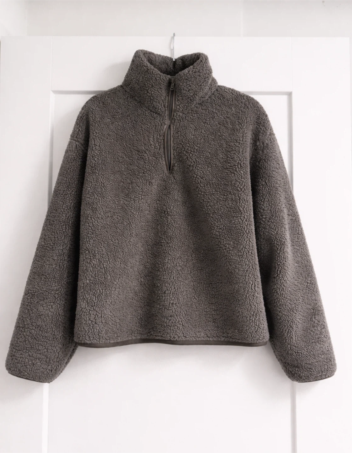 Cozy grey teddy fleece pullover with a quarter zip neckline. It's made from a soft, fuzzy material for warmth. This sweater is perfect for layering on chilly days!