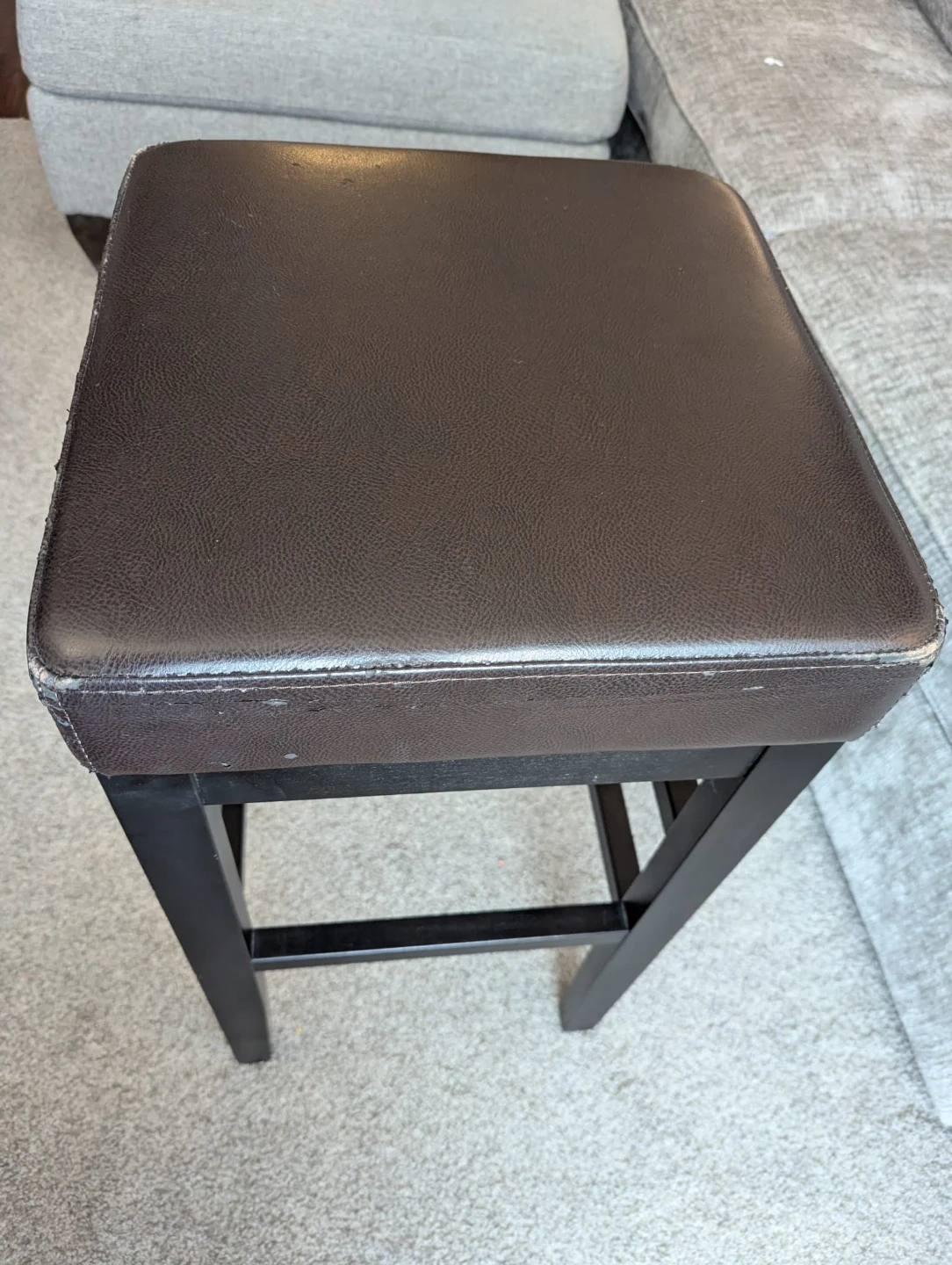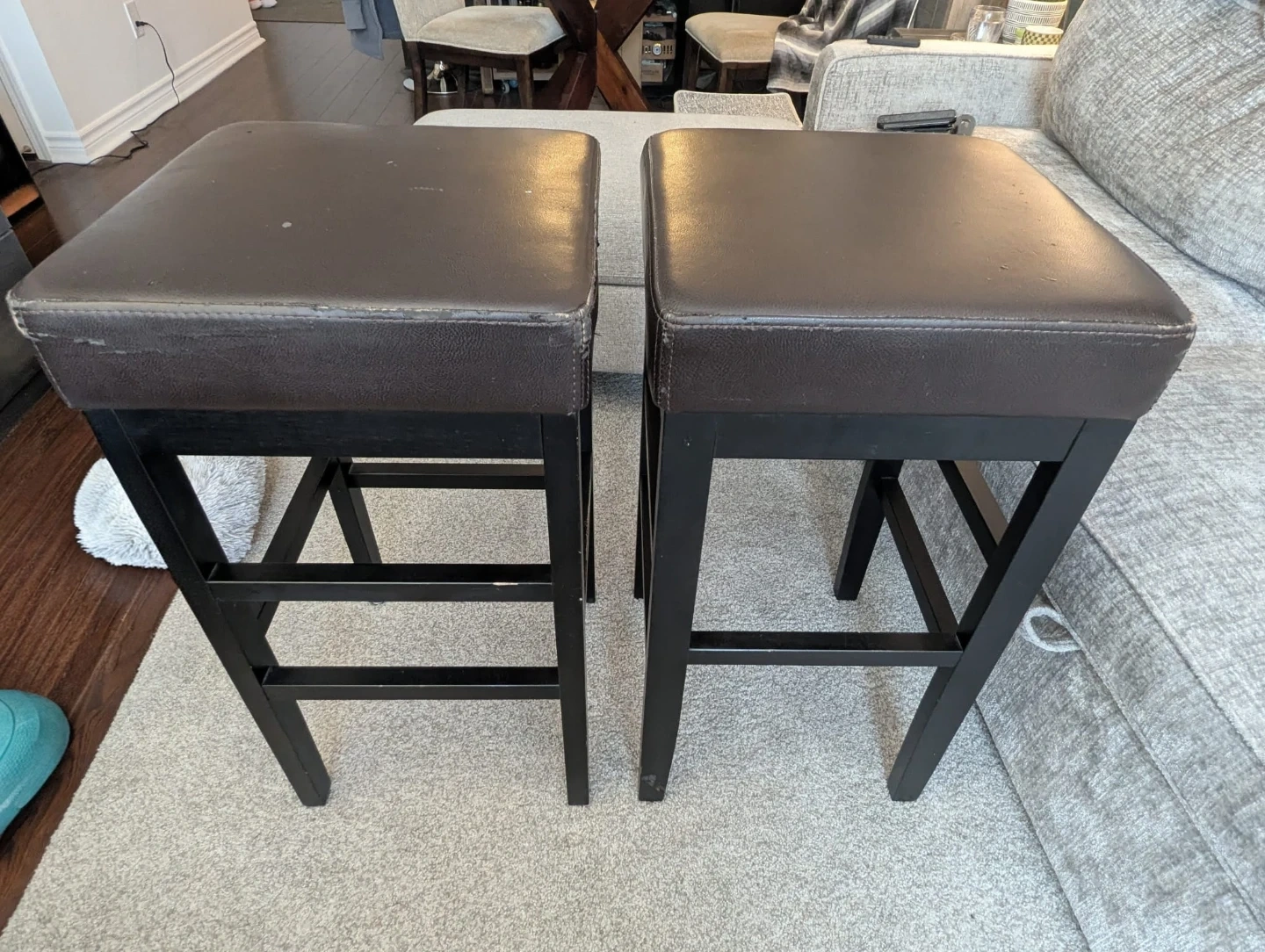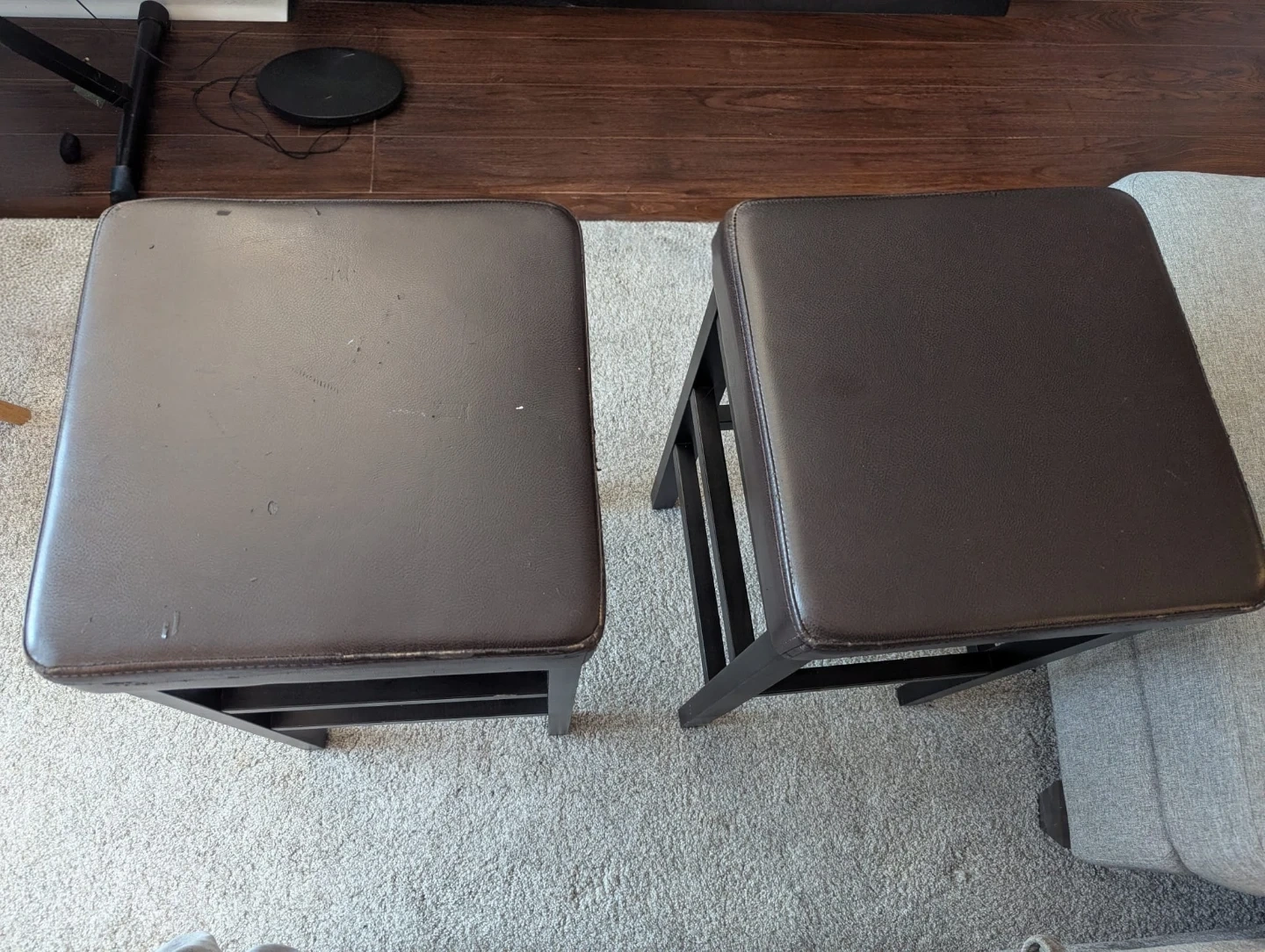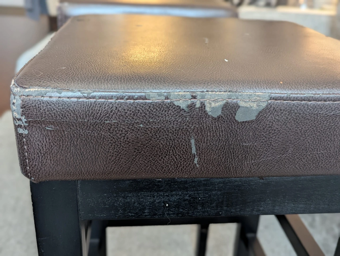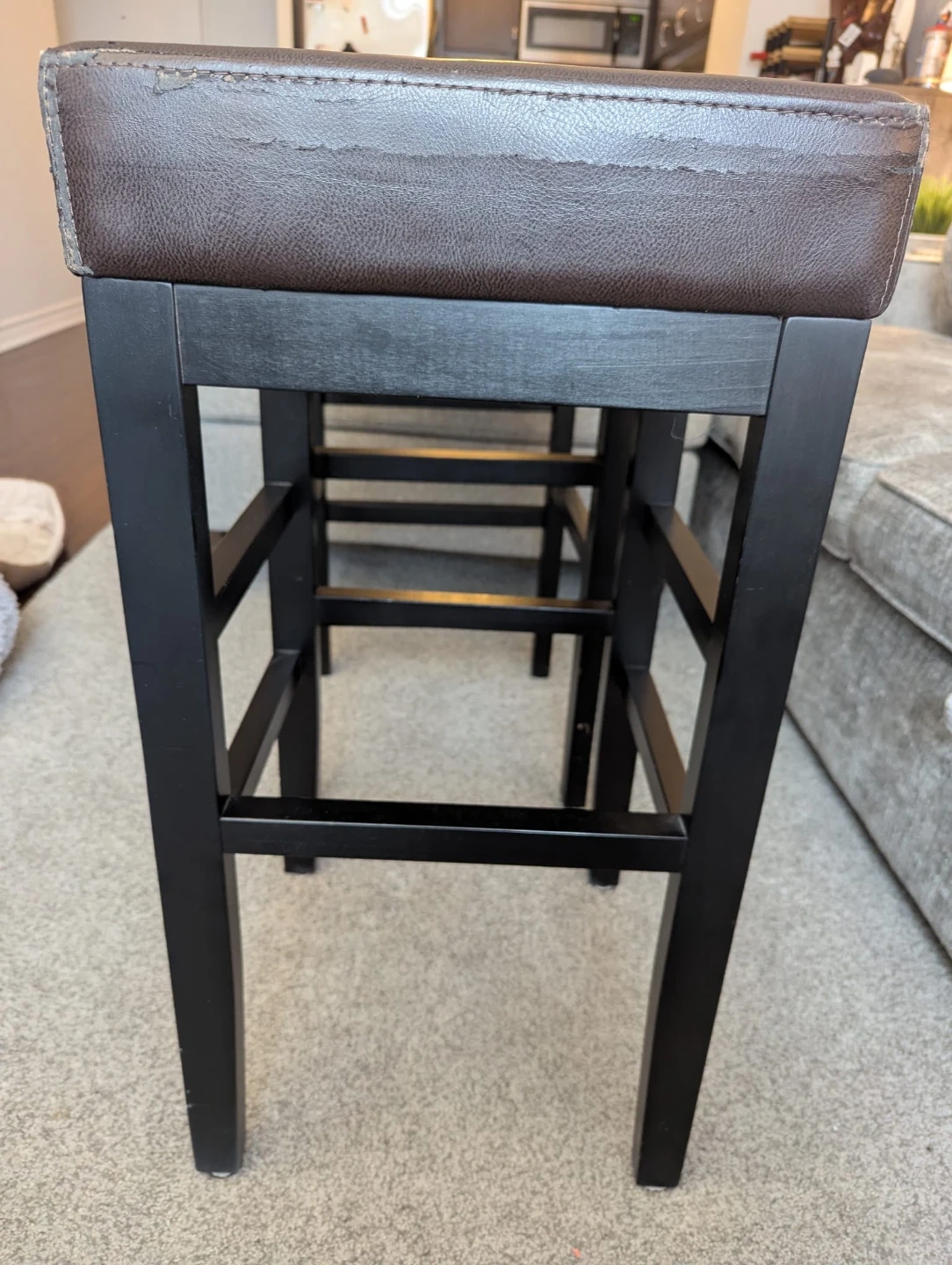 Selling two stools with a brown padded top and black legs. It shows some signs of wear, as seen in the photos. It's still sturdy and functional, great for adding extra seating!