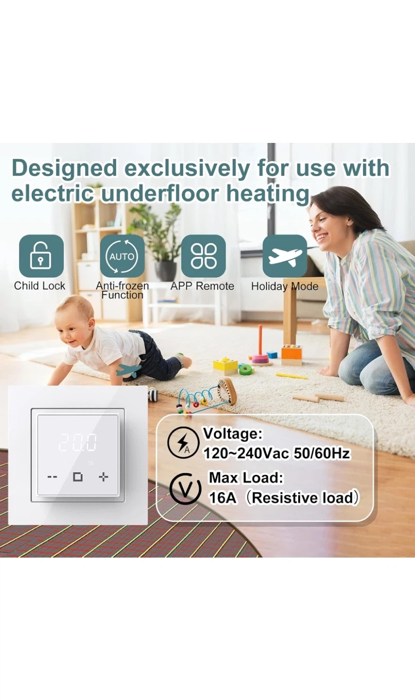 This programmable thermostat is designed for electric underfloor heating systems. It offers features like Child Lock, Anti-frozen Function, APP Remote control, and Holiday Mode. Voltage is 120-240Vac 50/60Hz with a max load of 16A for resistive loads. You can tailor your comfort for any situation with weekly scheduling options.