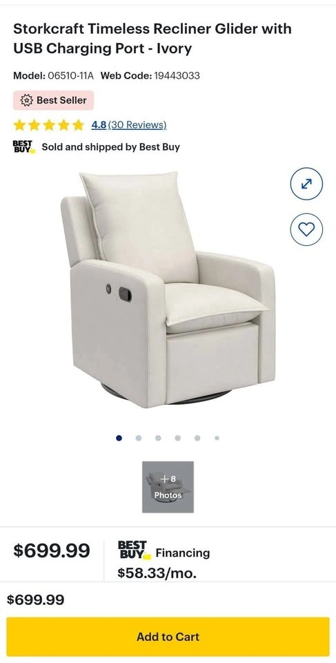 New Storkcraft Timeless Recliner Glider w/ USB - Ivory