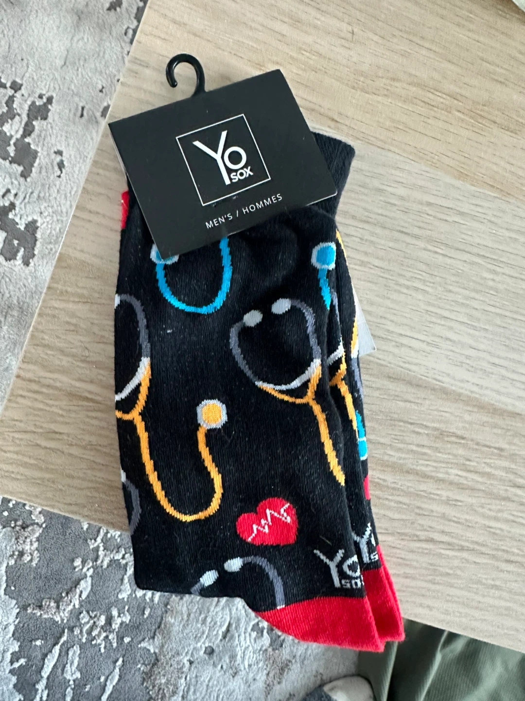 These fun YOSOX crew socks are designed for men, featuring a playful stethoscope and heart print on a black background with red accents. They're made from a comfortable cotton blend, perfect for healthcare professionals or anyone with a sense of humour! The size is 7-12.