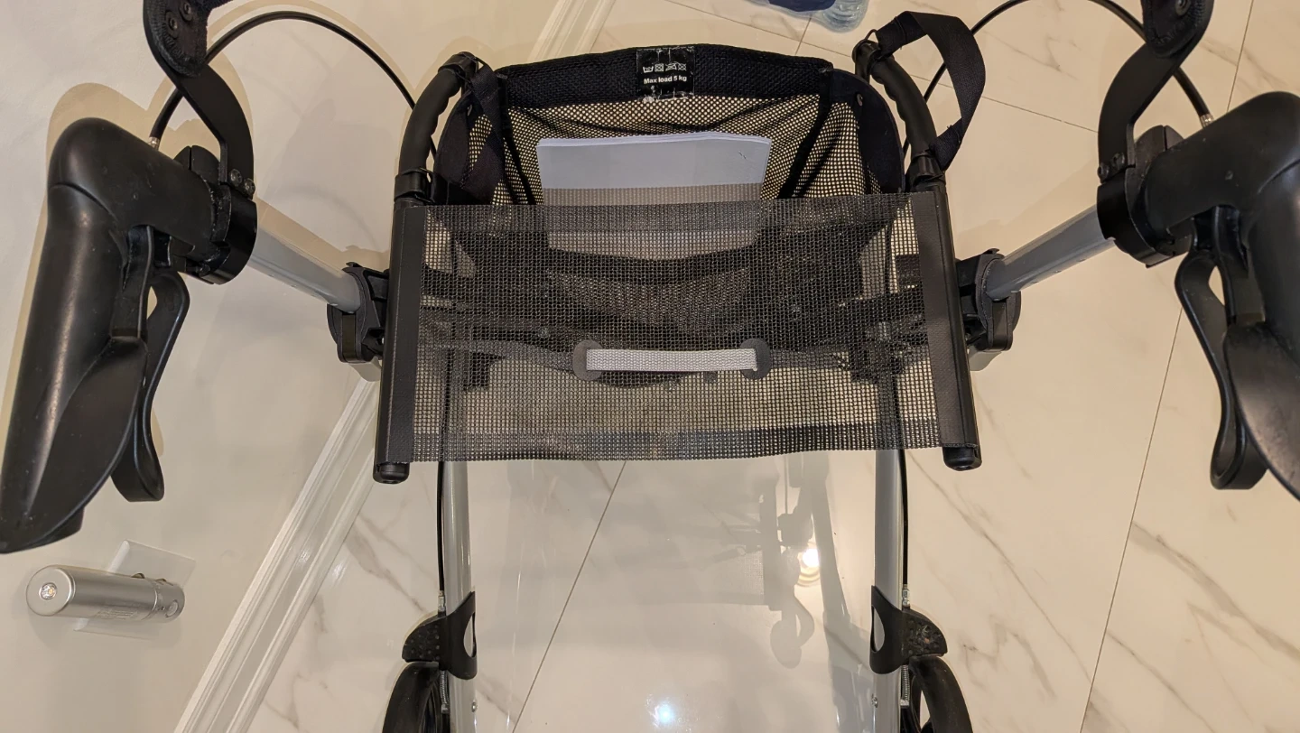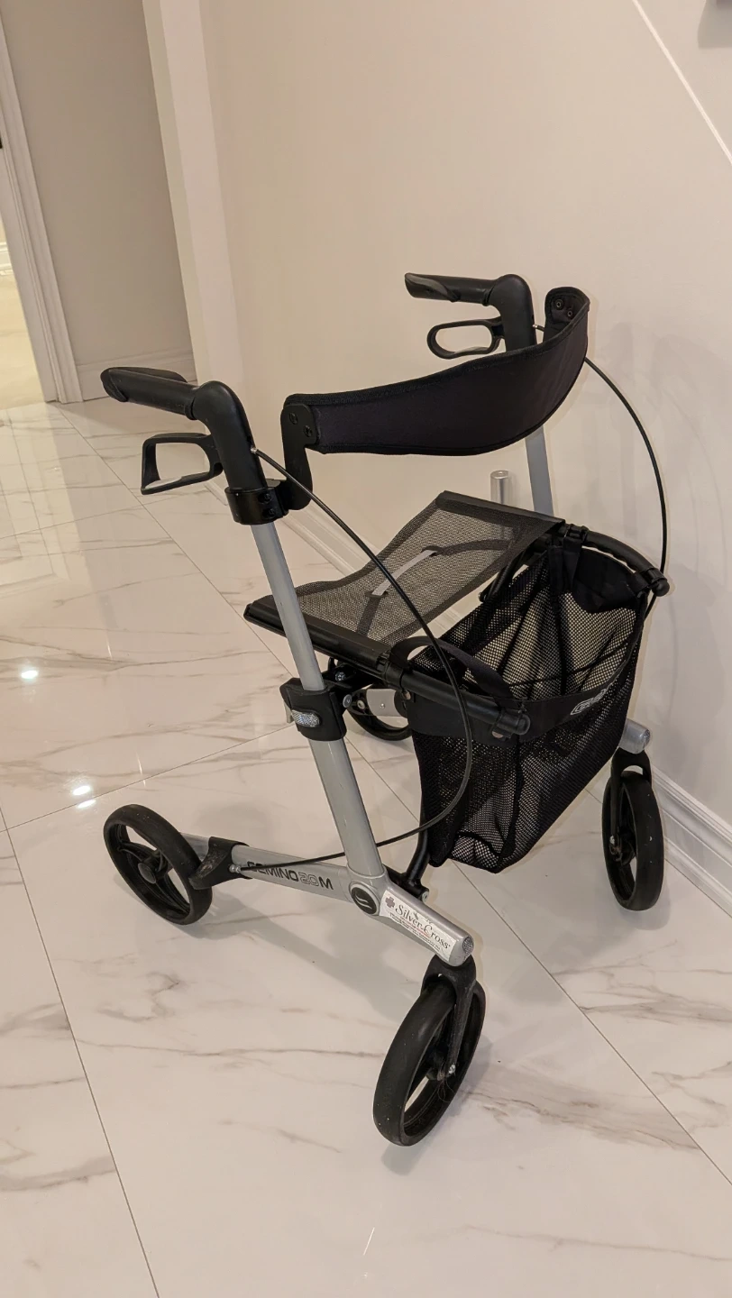 Gemino 20M walker rollator with a basket and seat. It's a helpful mobility aid for navigating spaces. It folds for easier storage and transport. All components work, rolls smoothly collapses with ease
