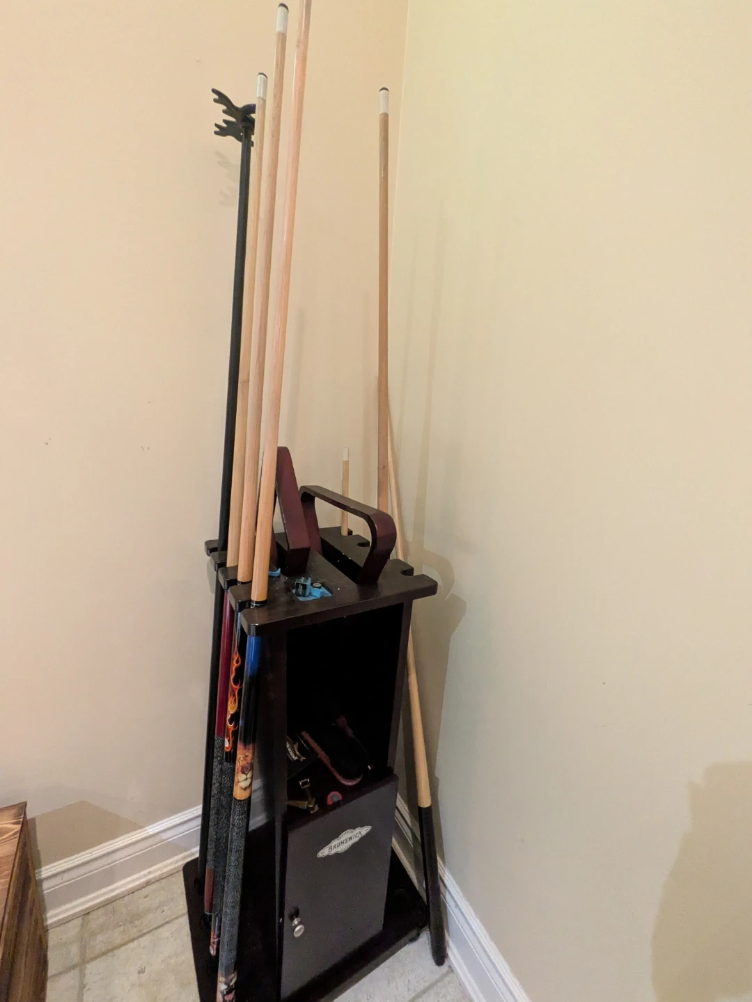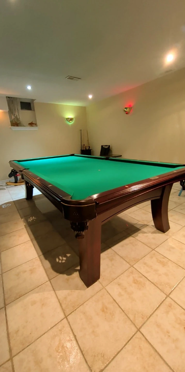 Nice pool table with a green felt surface. Includes a set of pool cues, balls and a wooden rack for storage. Ready for your games room!
