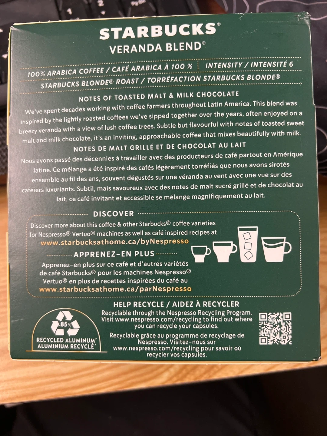 Starbucks Veranda Blend aluminum capsules for Vertuo machines. This ground coffee is 100g and offers notes of toasted malt & milk chocolate. It's a light roast.