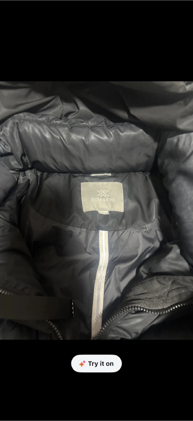 This is a SOIA & KYO puffer coat. It's a dark grey, hooded, full-zip jacket with a shiny finish. The jacket has a quilted design and ribbed cuffs. Pick yo cash only