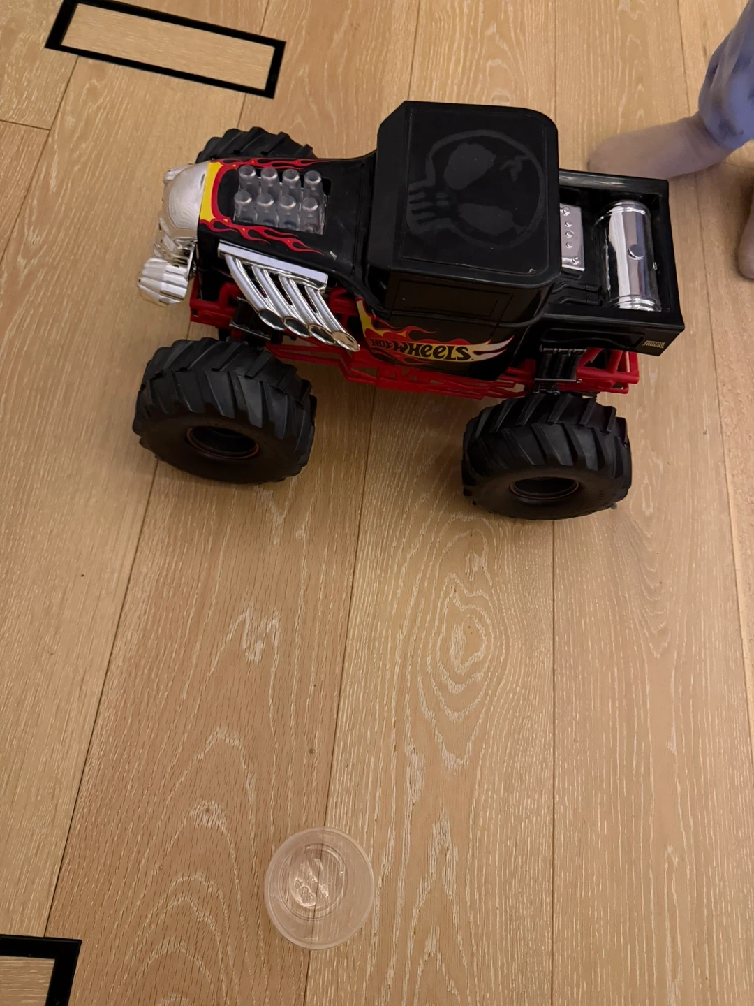 This is a Hot Wheels monster truck with a black, red, and yellow flame design. It has large, durable tires perfect for rough play. It's a cool toy for kids who love trucks!