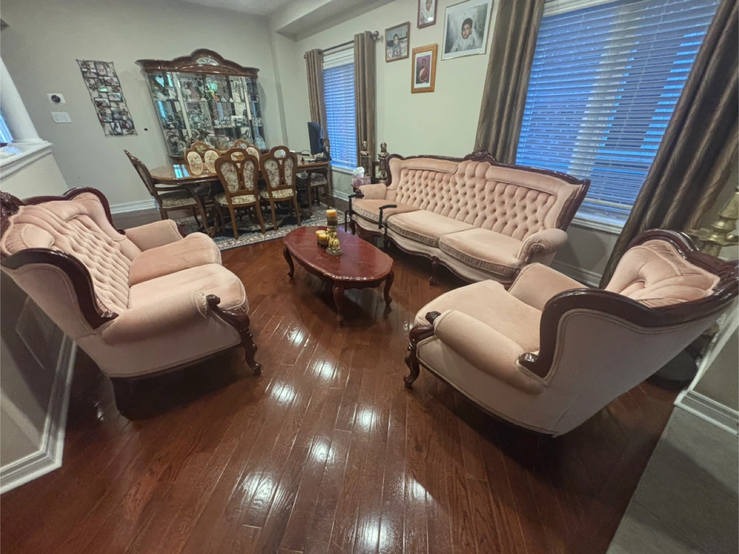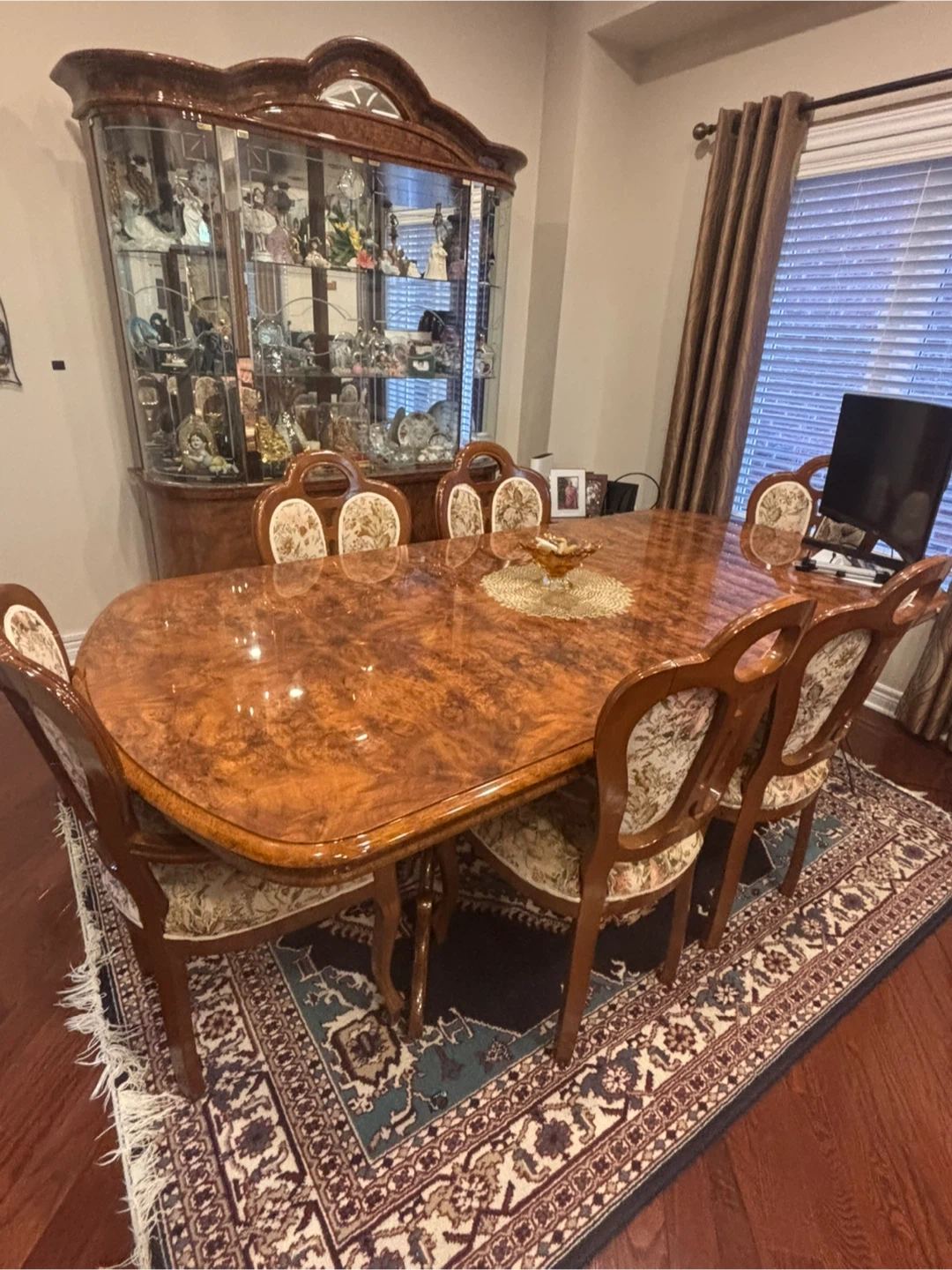Beautiful wooden dining set including an oval table with six upholstered chairs. It also comes with a glass-door curio cabinet for display. This set would be a lovely addition to your dining room or living space!