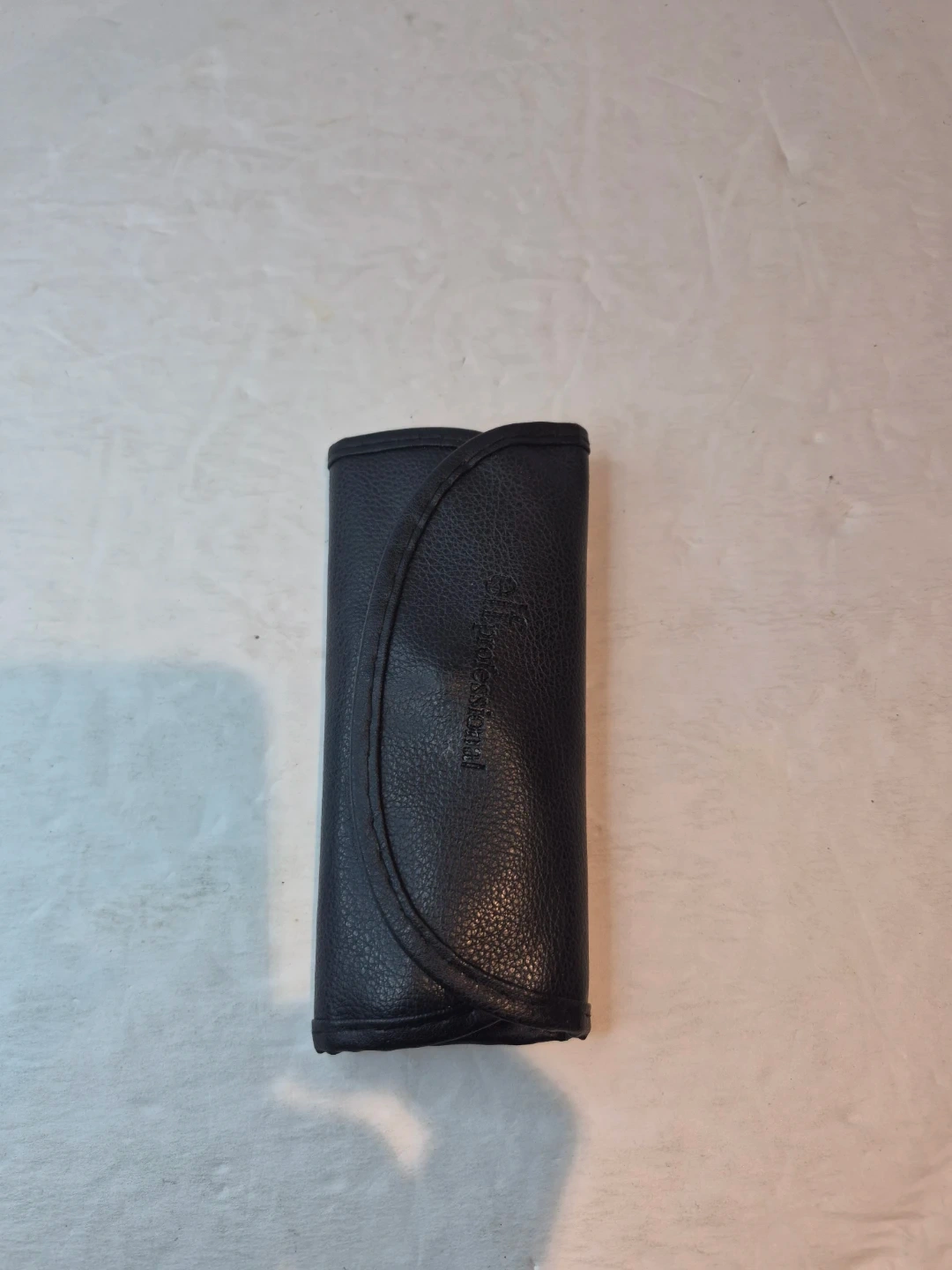 5-piece makeup brush set from e.l.f. Essentials. It includes various brushes and a comb, all housed in a black faux leather case. The case has a snap closure to keep everything secure. It's handy for on-the-go touch-ups!