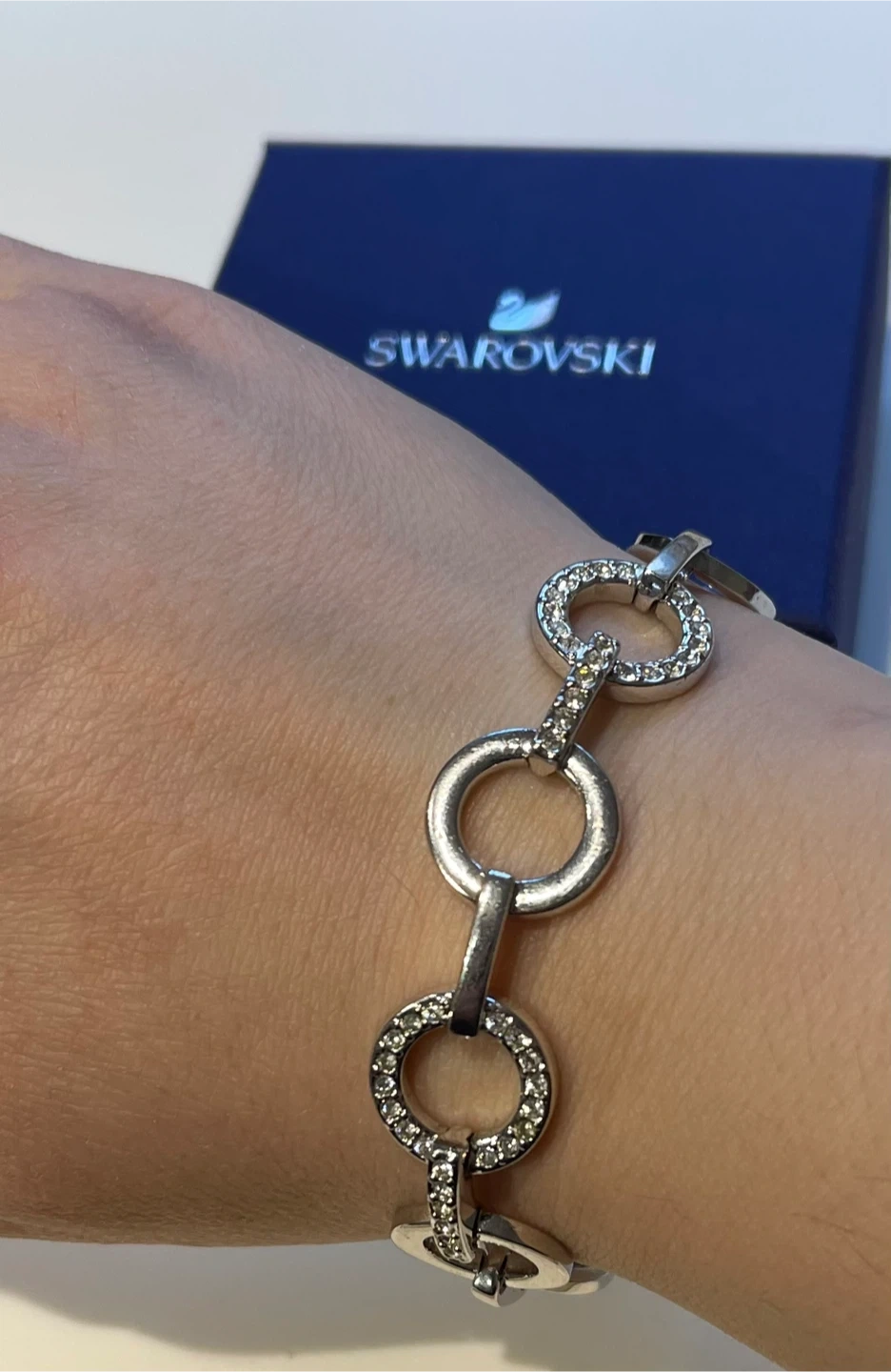 Beautiful Swarovski bracelet featuring interlocking circular links adorned with sparkling crystals. It fastens with a secure toggle clasp. This elegant piece comes with its original Swarovski box.