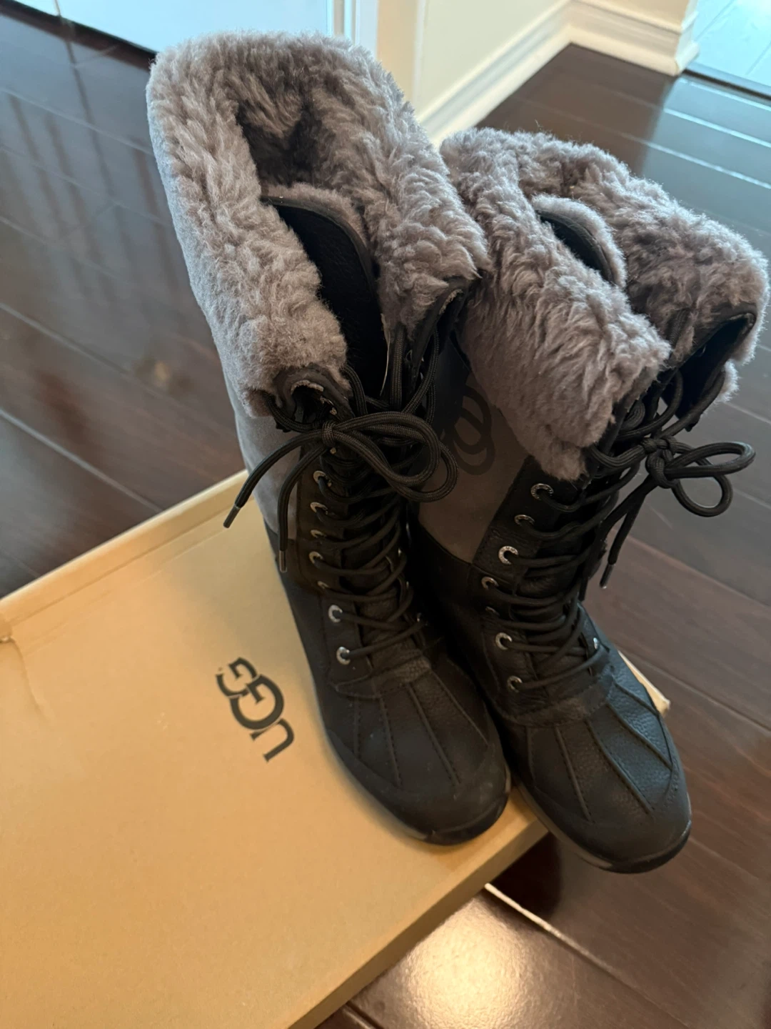 These UGG winter boots are black with grey faux fur lining and trim. They feature a lace-up front and a waterproof rubber toe. Perfect for keeping your feet warm and dry during the colder months!