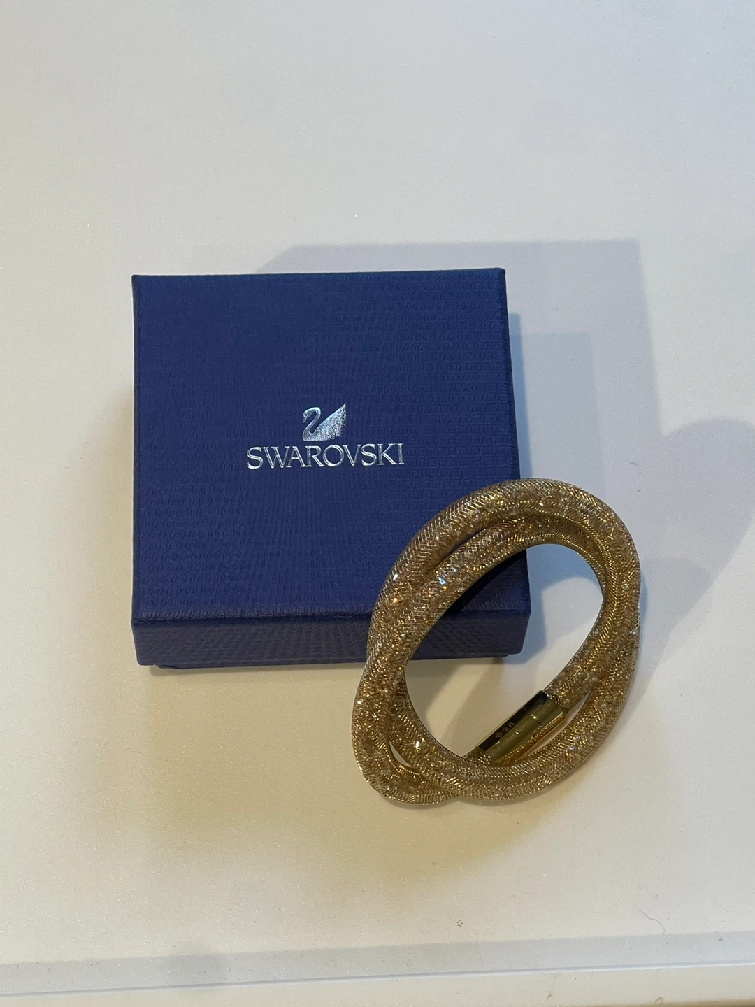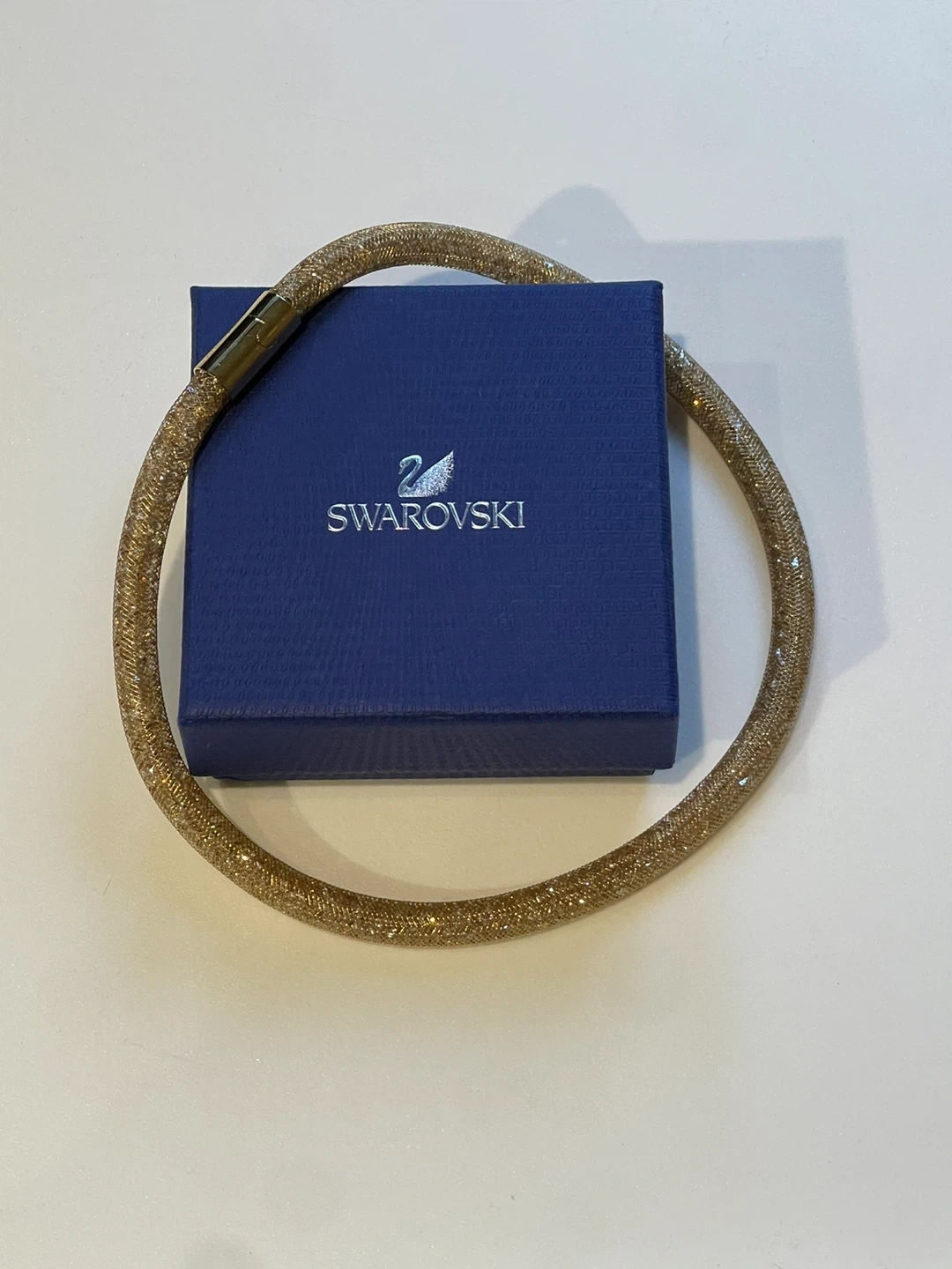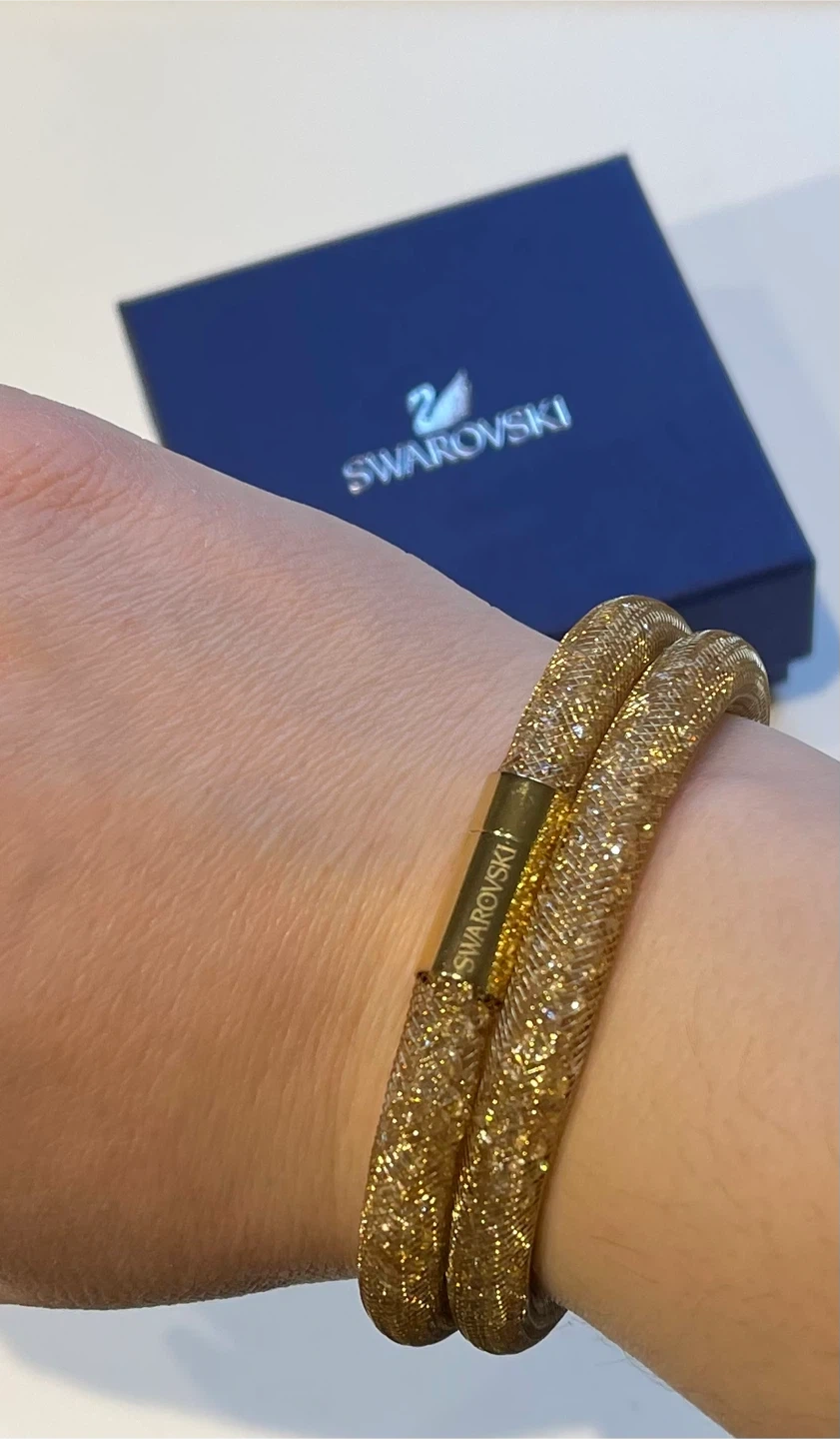 Sparkly gold-toned bracelet from Swarovski. It's designed with a mesh tube filled with tiny crystals and features a magnetic clasp for easy wear. Comes with the original blue Swarovski box.