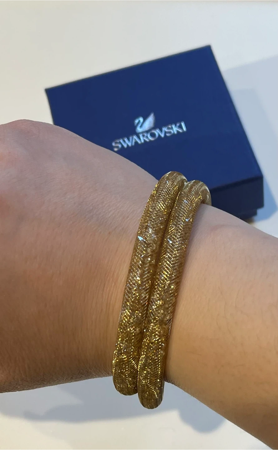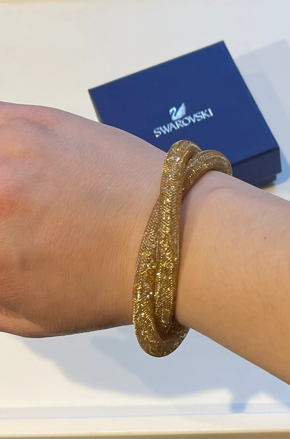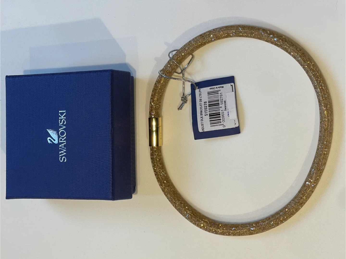 Sparkly gold-toned bracelet from Swarovski. It's designed with a mesh tube filled with tiny crystals and features a magnetic clasp for easy wear. Comes with the original blue Swarovski box.