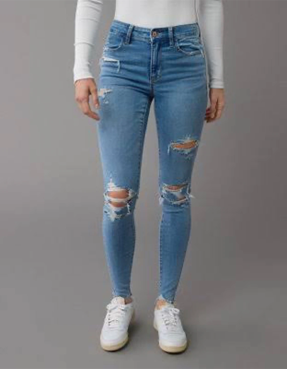 These are a pair of light wash, distressed super skinny jeans from h&m and are stretchy. They feature ripped knees and a frayed hem.