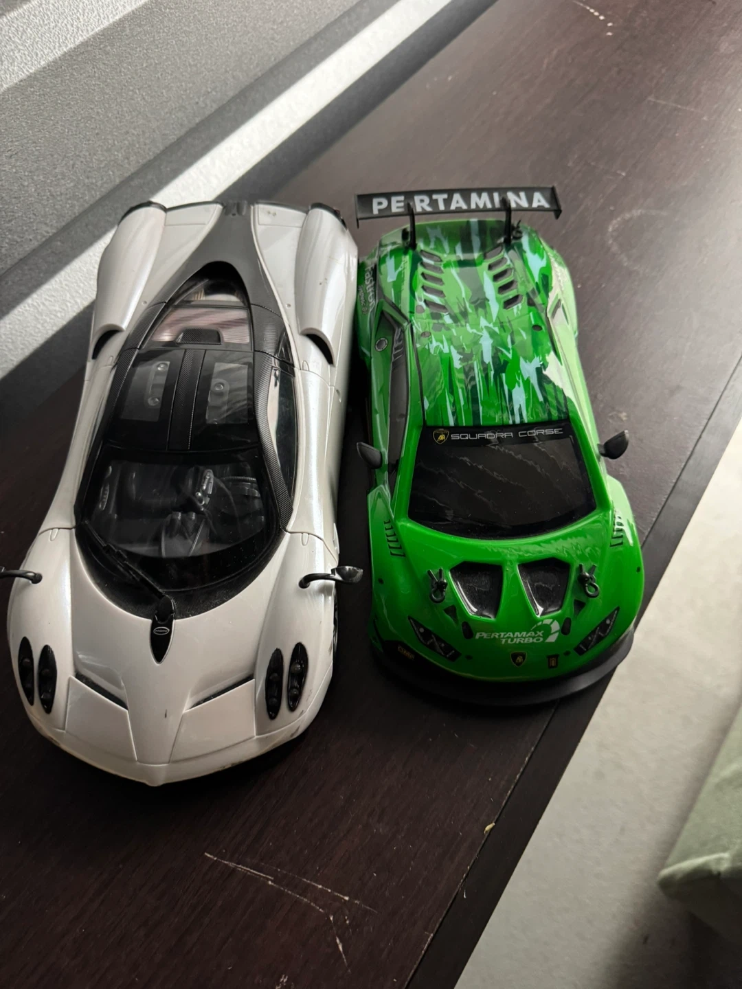 This listing includes two die-cast toy sports cars, one white and one green. The green car features 'PERTAMINA TURBO' branding and 'SQUADA CORSE' text. These are detailed models for collectors or play.