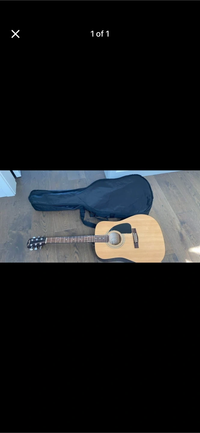This is a Fender acoustic guitar. It comes with a black gig bag. It's a great instrument for learning or casual playing!