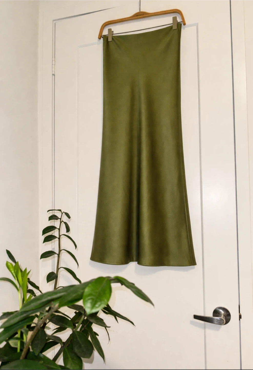 This H&M crêpe satin skirt comes in a light khaki green colour. It's made from a satin material and has a midi length. This skirt is perfect for dressing up or down has a stretchy fit
