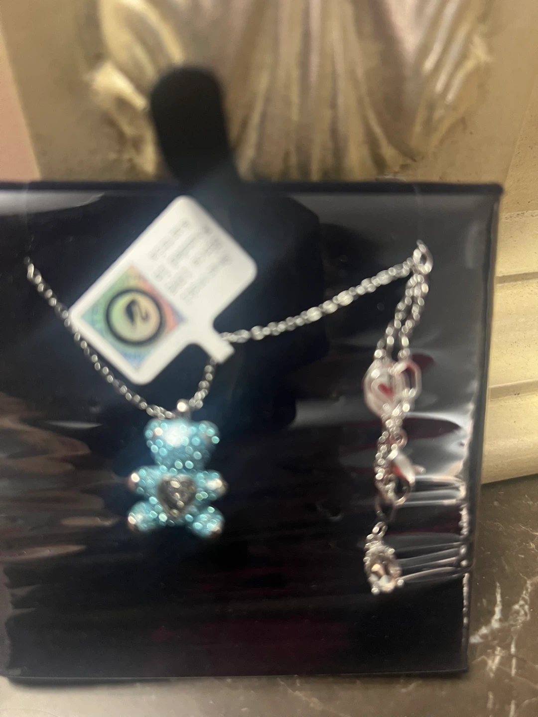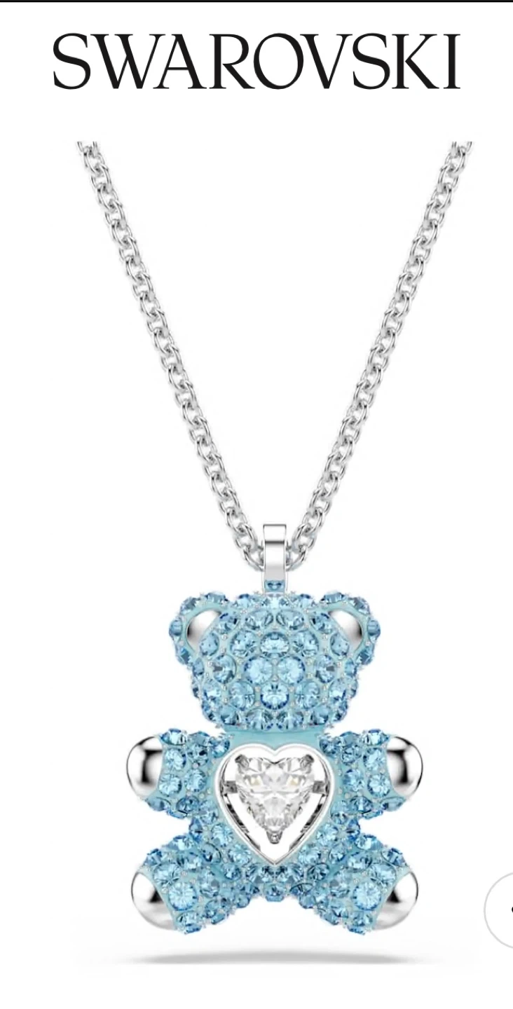 This is a Swarovski teddy bear pendant necklace. The set features sparkling blue crystals and a silver-toned chain. It's a charming accessory for anyone who loves playful yet elegant jewellery!