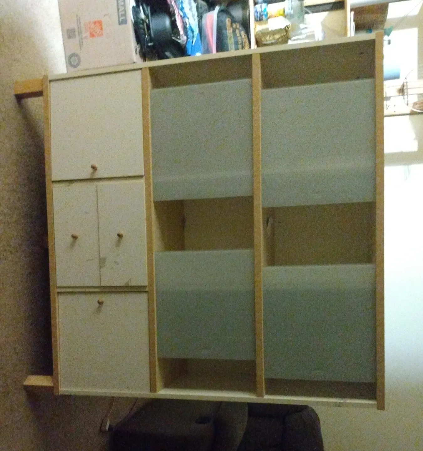 This is a versatile storage unit with a combination of open shelves and cabinet doors. It's made of particleboard with a wood-effect trim and has a light wood-tone interior. Some doors have small wooden knobs for opening. It's useful for organizing various items around the house.