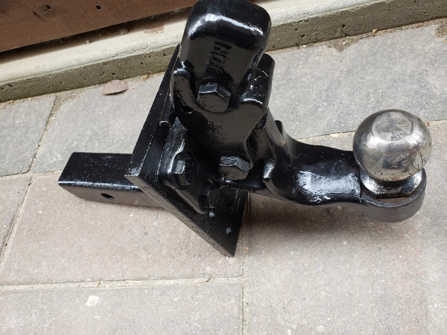This is a heavy-duty hitch mount trailer ball mount. It's made of sturdy black metal and comes with a 2-inch ball. A secure way to tow your trailer!