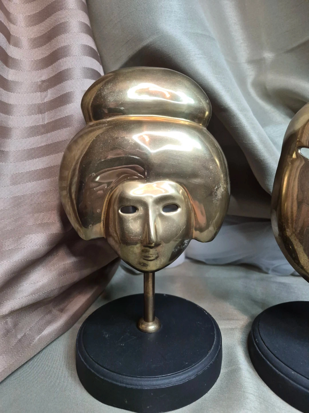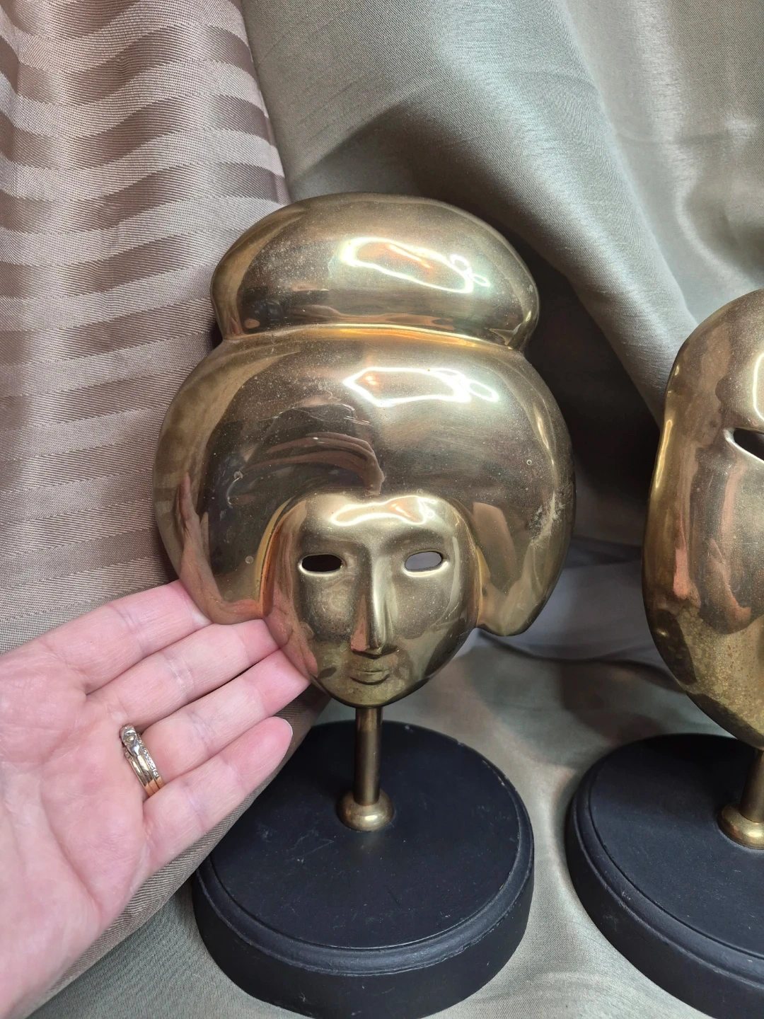 Pair of Vintage Solid Brass 9 1/2" Tall Asian Mask Decor on Bases Excellent Vintage Condition Please see all pictures selling as a Pair
