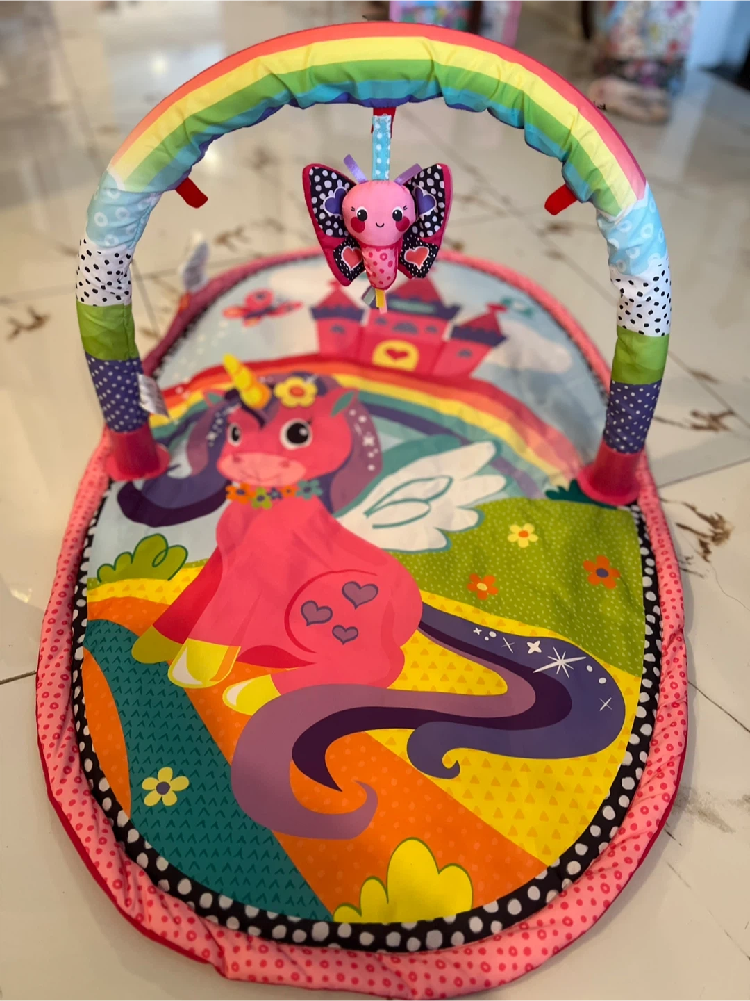 This Infantino activity gym is designed for little ones to explore and play. It features a colourful mat with a unicorn theme and a detachable arch with hanging toys. The gym also folds for easy storage.