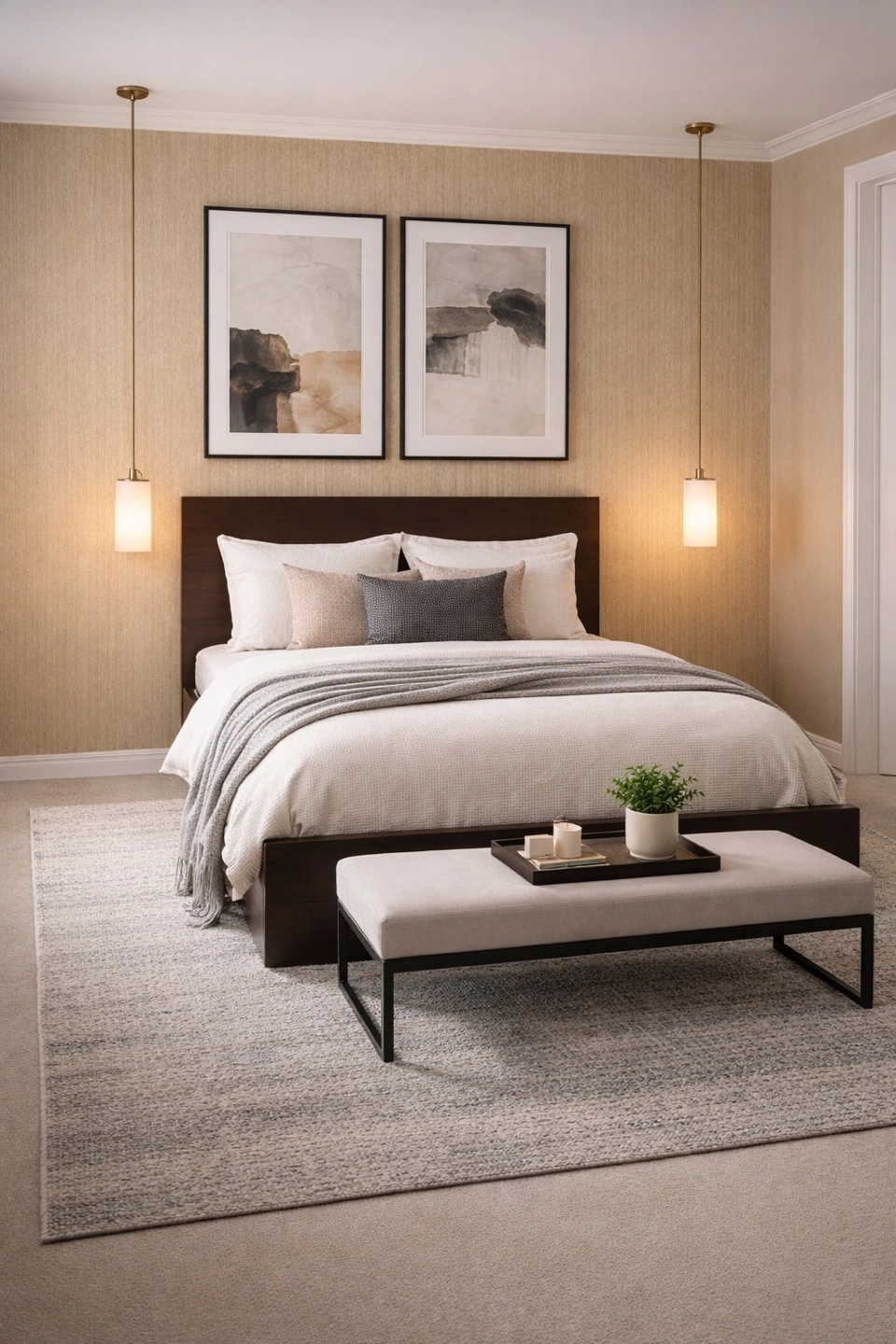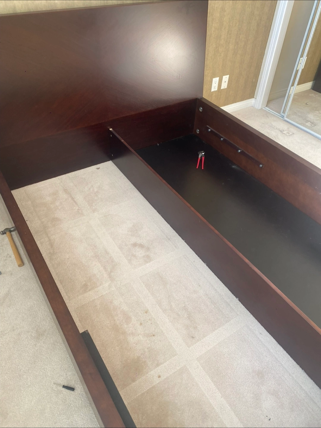 Queen size platform bed frame featuring a dark wood finish and ample under-bed storage. It's designed for modern bedrooms and offers practical storage solutions. The sturdy frame supports your mattress with ease.
