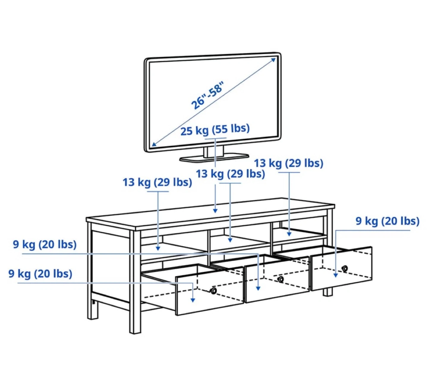 White TV stand featuring three drawers and two open shelves. This unit supports TVs from 26" to 58". Each drawer holds up to 9 kg (20 lbs), and the shelves each support 13 kg (29 lbs). The top surface can hold up to 25 kg (55 lbs). Perfect for organizing media consoles and accessories!