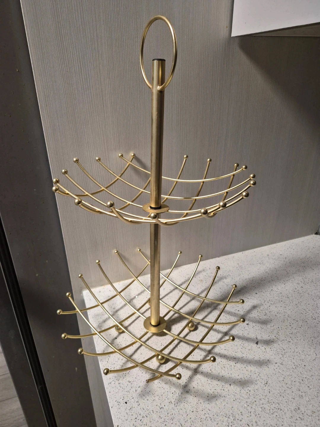 A stylish two-tier fruit bowl stand in a gold finish. It's designed to hold fruits or other small kitchen items. This stand would look great on a countertop or table!
