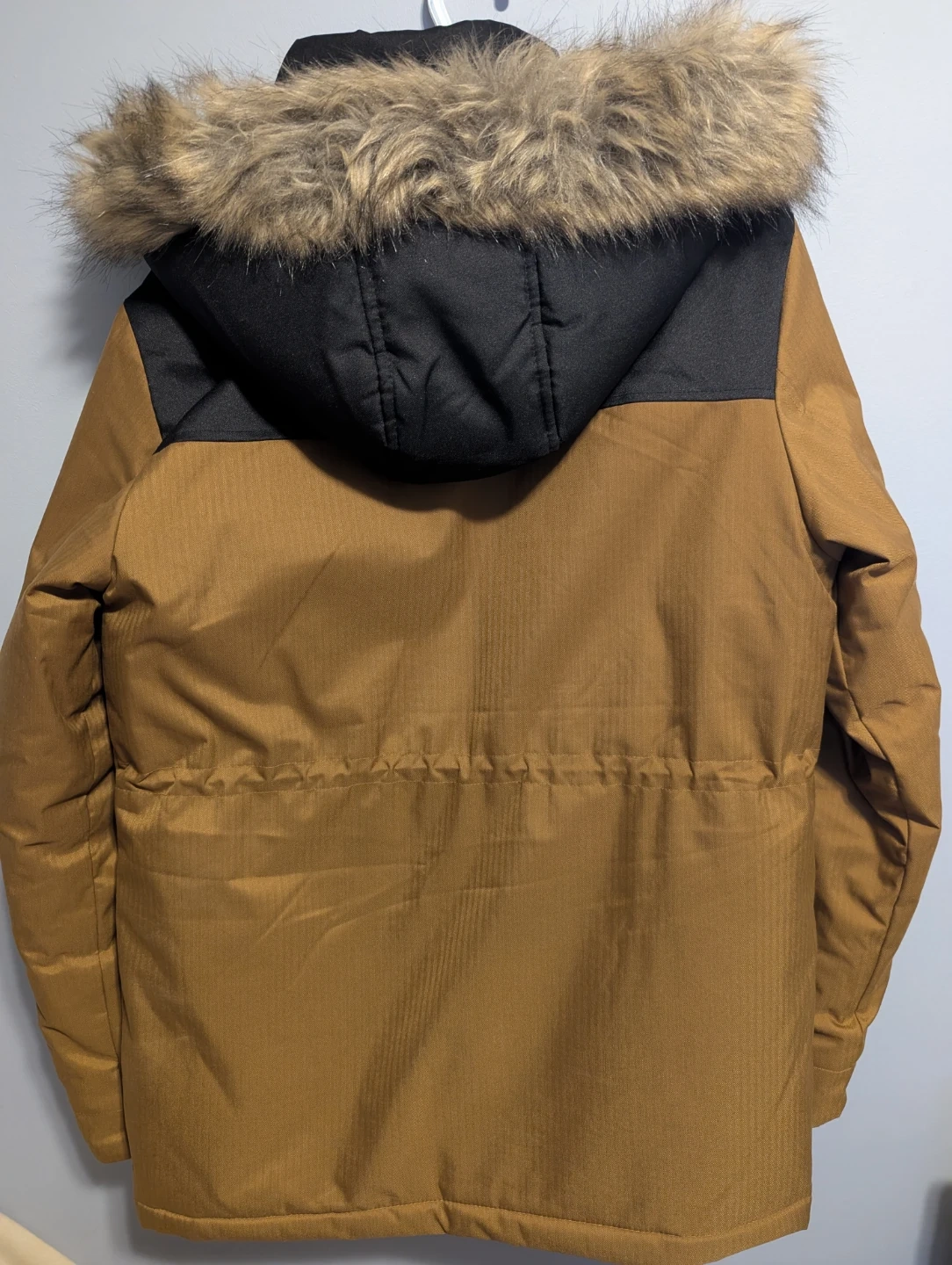 This George. parka jacket is brown with black accents and a faux fur-lined hood. It features multiple front pockets and a drawstring waist. Size is S/P.