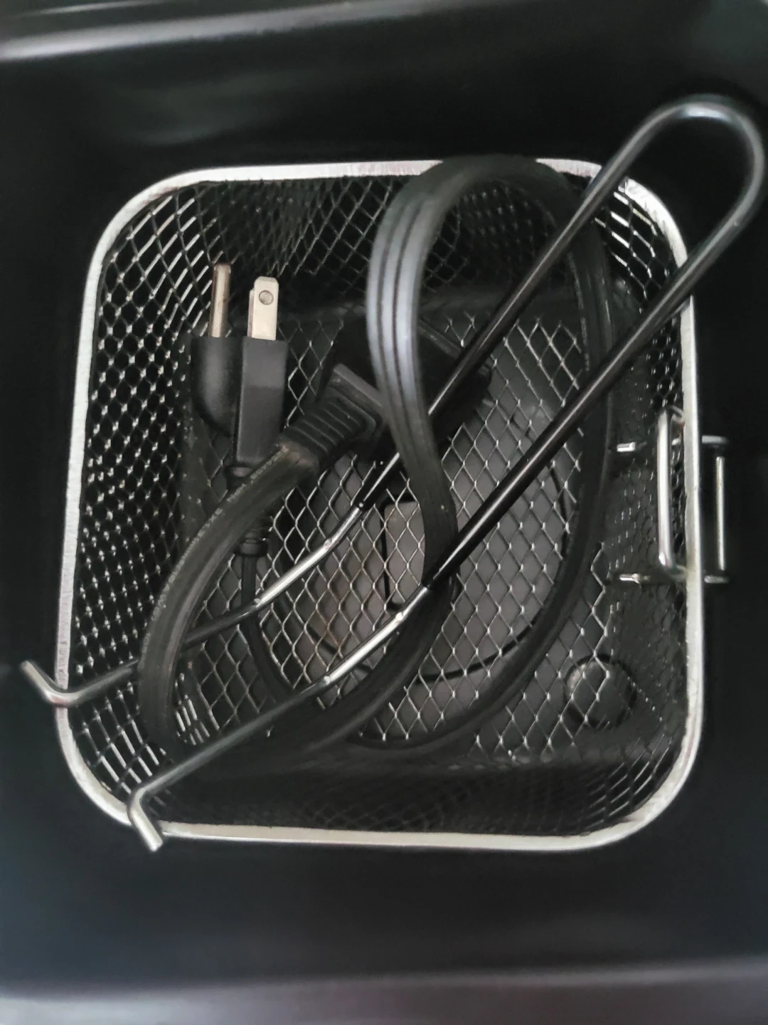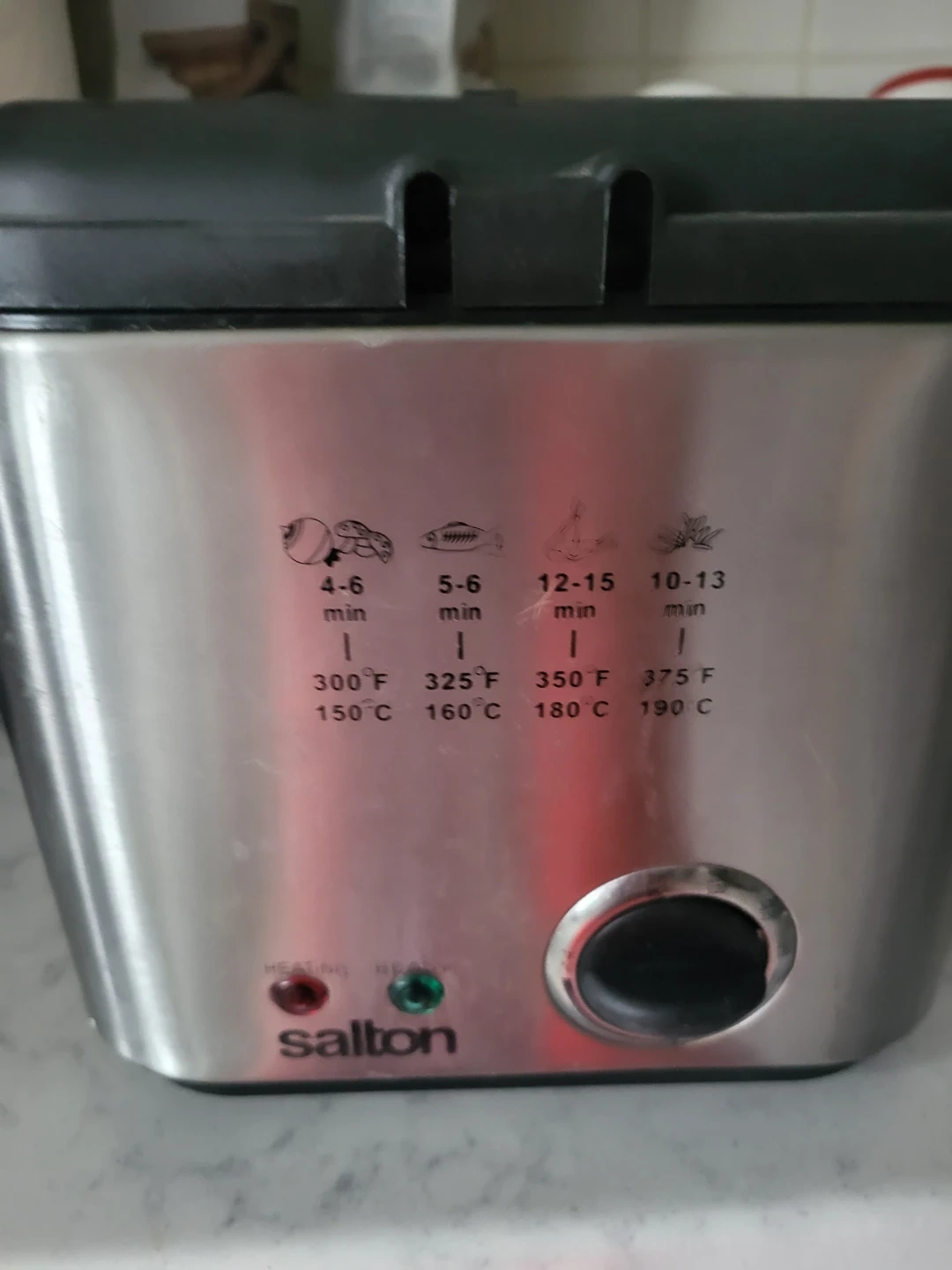 Brand new never usedThis compact Salton deep fryer has a brushed stainless steel exterior. It includes a removable frying basket and power cord. Cooking temperature and time guides are printed on the front.