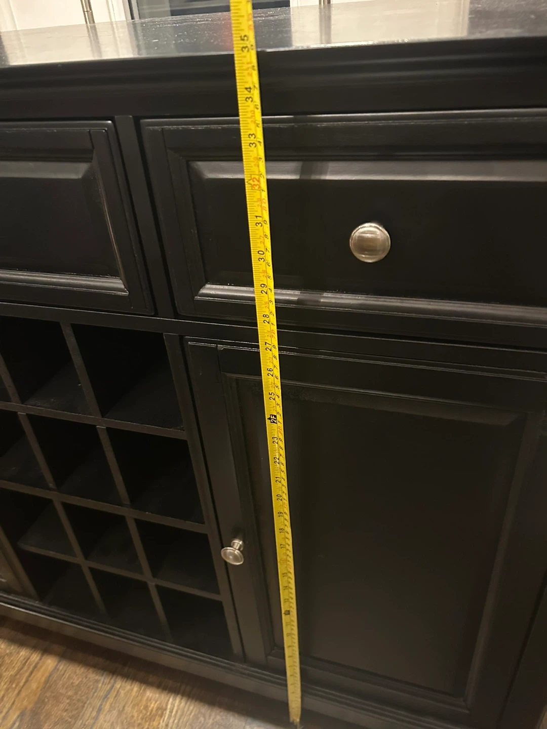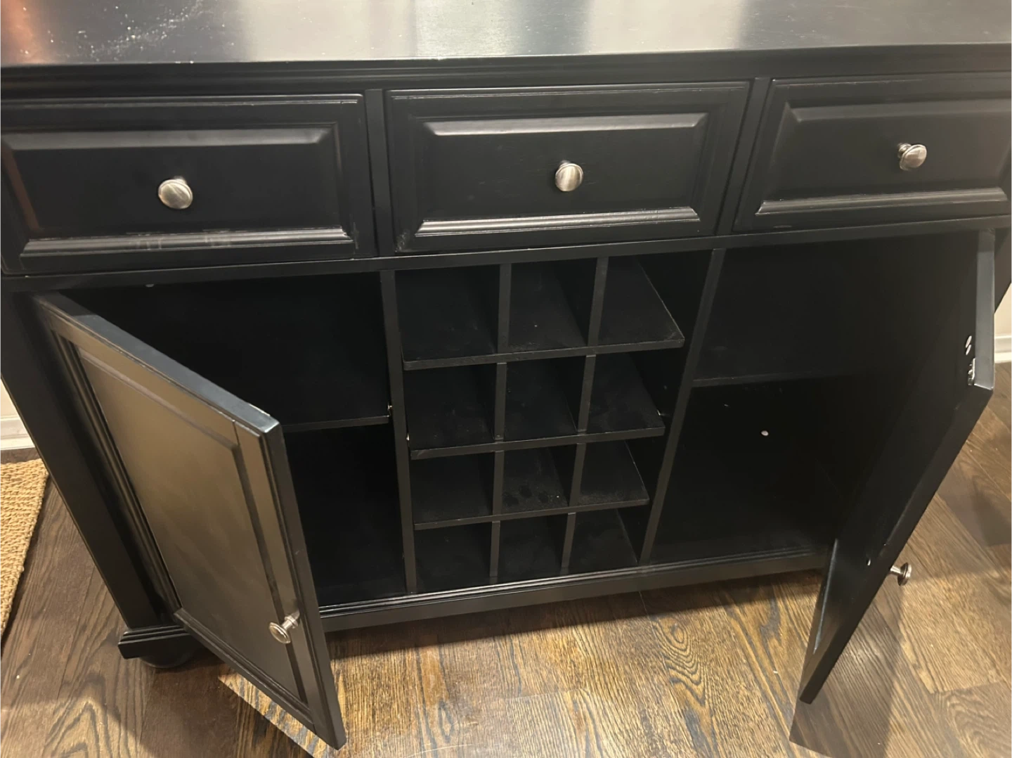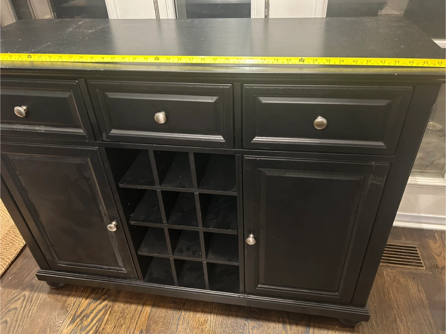 Black buffet server with wine storage. It has three drawers and two cabinets. Dimensions are approximately 46 inches wide and 35 inches tall. This cabinet offers ample storage and display space.