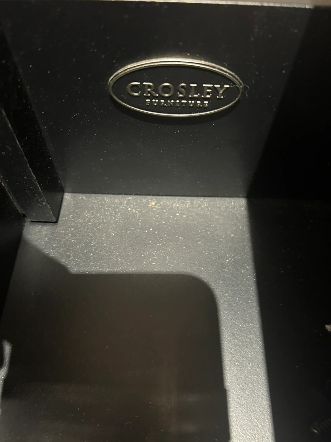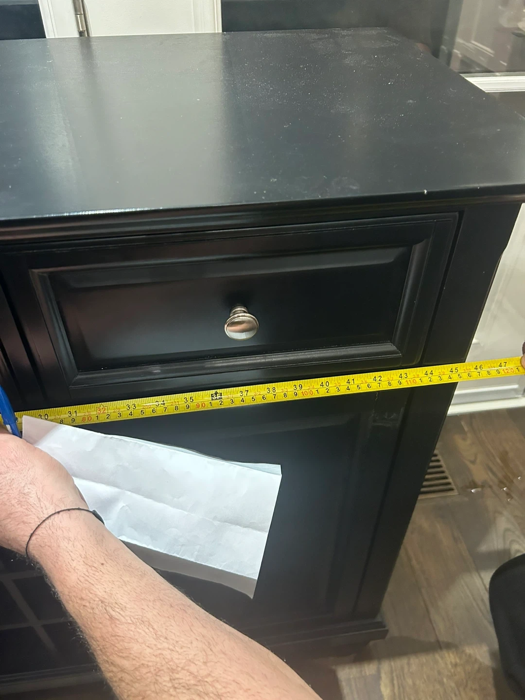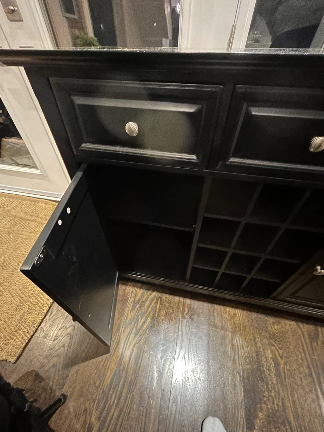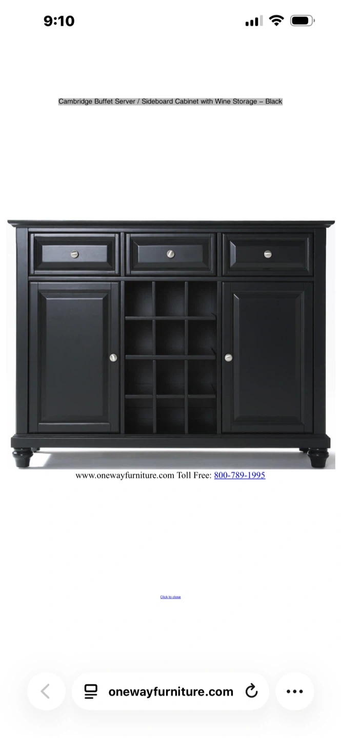 Black buffet server with wine storage. It has three drawers and two cabinets. Dimensions are approximately 46 inches wide and 35 inches tall. This cabinet offers ample storage and display space.