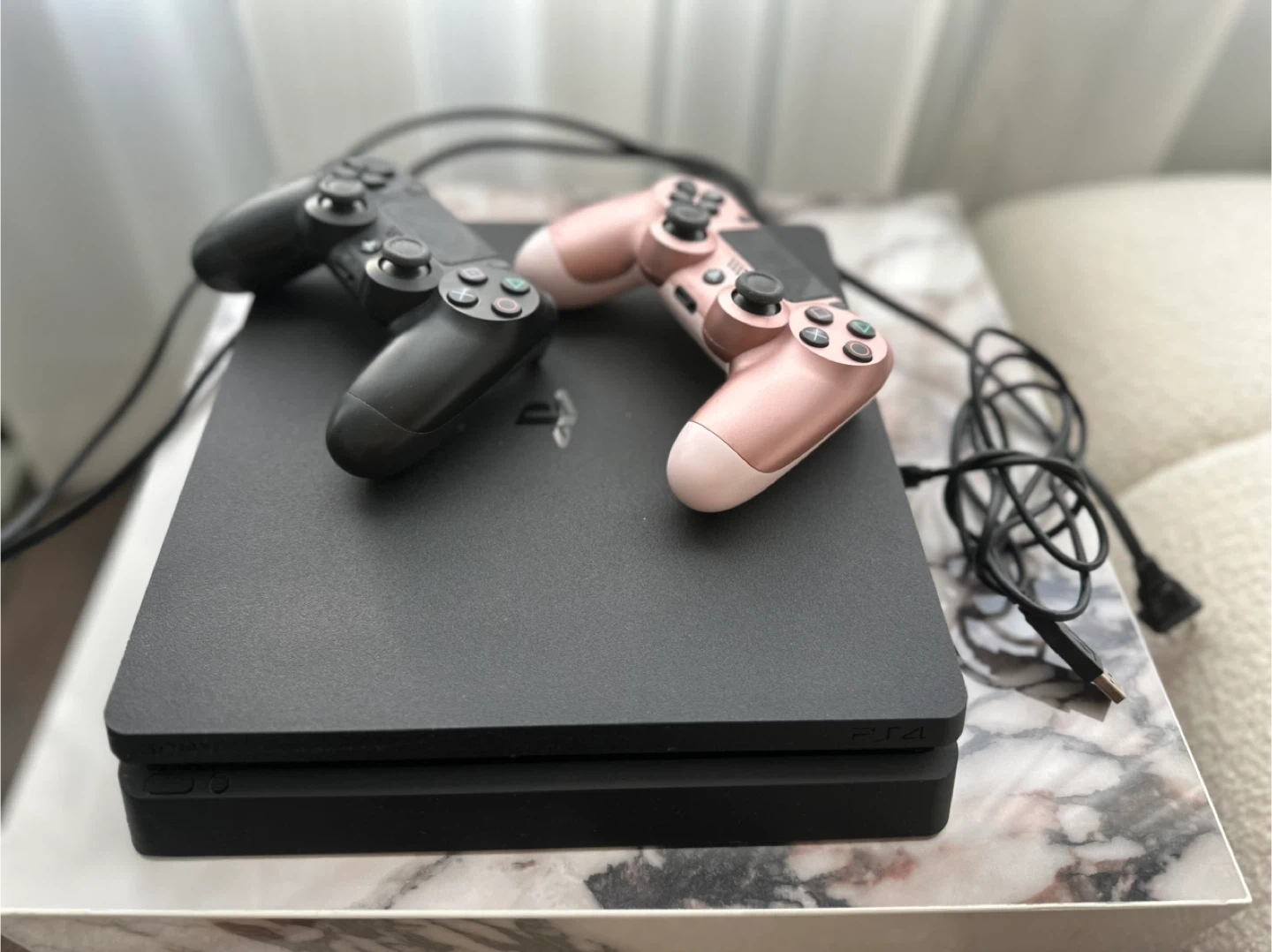 This is a PlayStation 4 Slim console. It comes with two DualShock 4 controllers: one black and one rose gold. It's ready for gaming adventures!