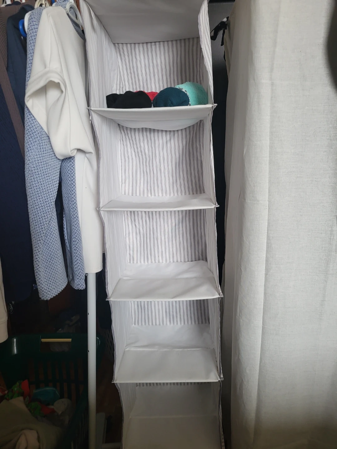 White striped fabric hanging closet organizer with multiple shelves. It's great for storing folded clothes, accessories, or other small items.