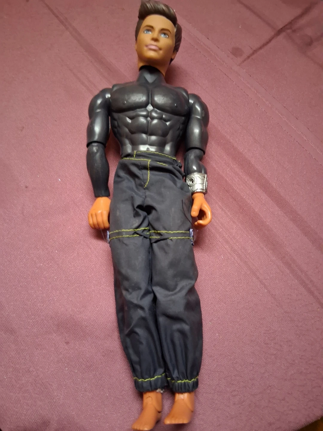 This is a male action figure doll with a muscular physique. It's wearing a black outfit with dark pants. The doll has brown hair and blue eyes. The articulated limbs allow for various poses.