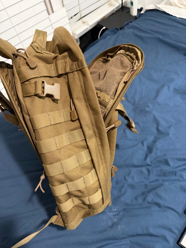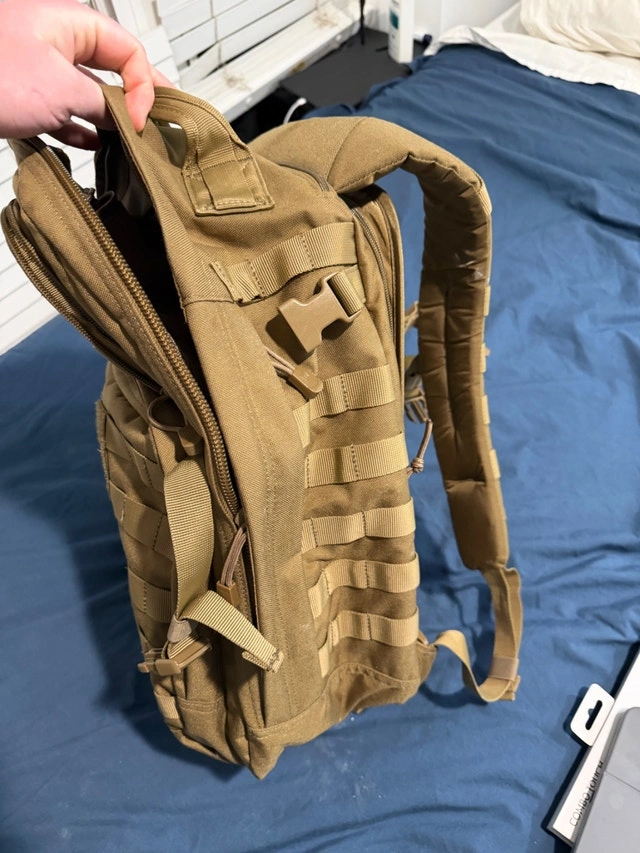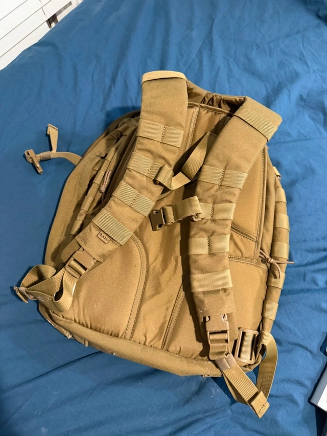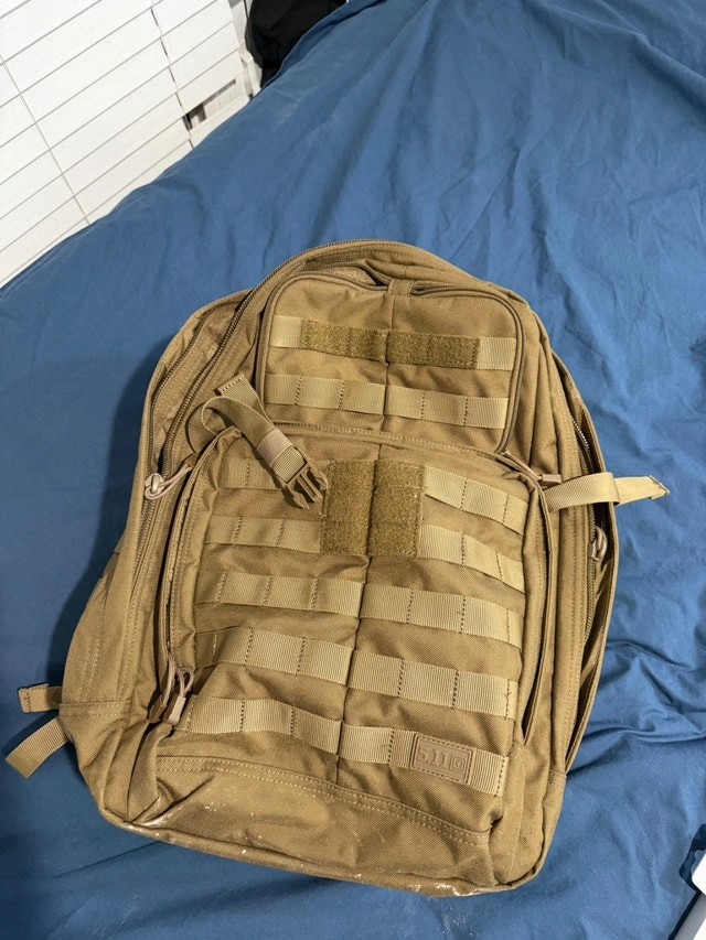 This is a 5.11 RUSH 24 2.0 backpack in like-new condition. It features 5.11’s signature Center Line™ design, dual top zippered pockets, external front and side web MOLLE, a fleece-lined eyewear/media pocket, and dual external side zippered pockets. The main compartment includes a padded laptop sleeve and dual mesh pockets, with a rear hydration compartment. It also has a contoured yoke shoulder strap system with web MOLLE and bottom panel web gear loops. Built from high-strength, water-repellant 1050D nylon. Compatible with the RUSH® Tier System. The MOLLE Web platform allows for modular attachments. Features a quick detach/connect sternum strap, back panel ventilation channels, and closed cell foam padding. The large zippered front pocket has an interior admin panel, key hook, and stash pockets. Includes a concealed CCW compartment. Main compartment dimensions are 20" H x 12.5" L x 8" D. Front pocket is 12.5” x 11” x 2”. Fits up to a 15" laptop in the sleeve. Hydration pocket is 17” x 12.5” / 2-liter. Total capacity is 2275 cubic inches / 37-liter. Weight is 3.85 lb. Cash and cashless payments are accepted.