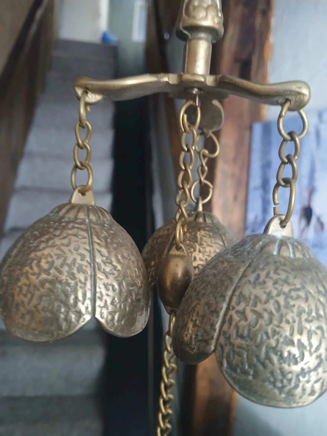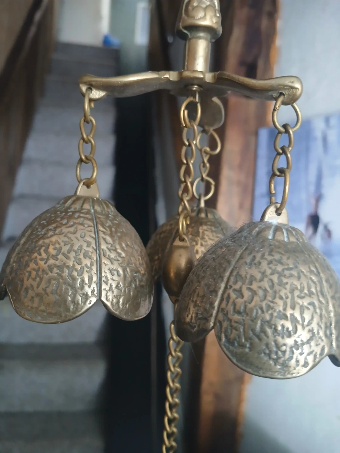 This is a decorative brass chandelier featuring three bell-shaped accents and a longer chain with a leaf-shaped pendant. It's crafted from brass with an embossed textured finish on the bells. This piece would add a unique touch to your home decor.