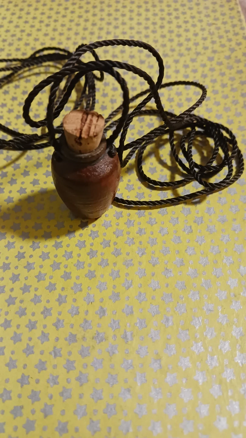 A tiny, handcrafted pendant resembling a miniature bottle with a cork stopper and a dark cord. This unique piece adds a whimsical touch to any outfit. Great for displaying tiny keepsakes or as a unique gift! Can be used as a diffuser! Sold separately!