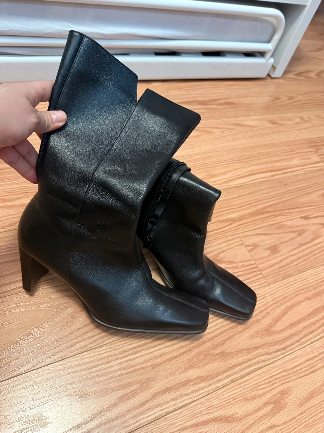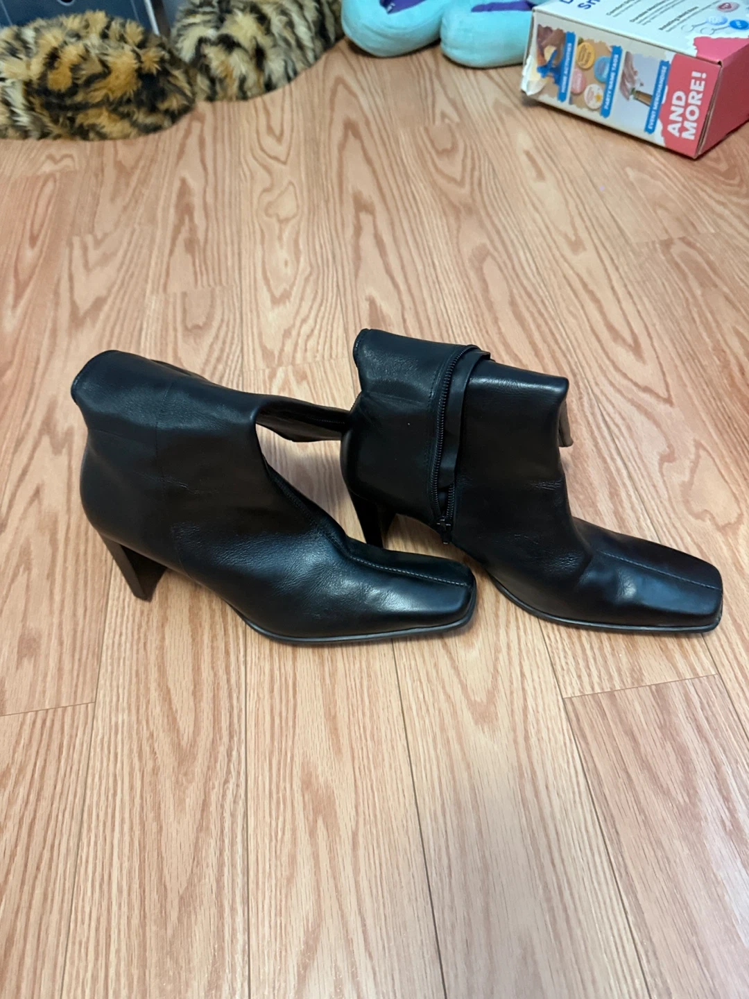 These are black leather ankle boots from Hush Puppies. They feature a side zipper closure and a square toe. Perfect for dressing up or down! Just need some rubber replacement from the heel. See photo.