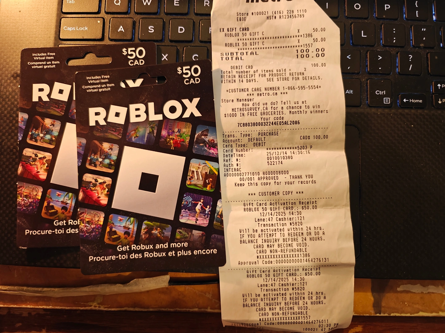 I have two Roblox gift cards, each with $50 CAD. They're brand new and ready to be used for Robux and more! Purchased by accident. $40 each or both for $75