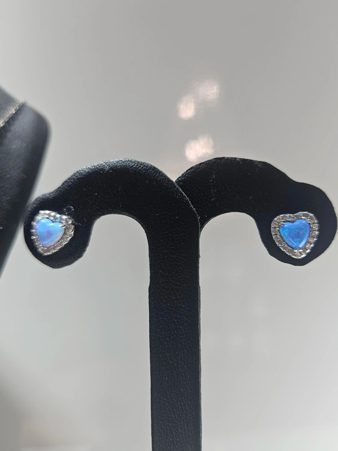 Beautiful heart-shaped pendant necklace and matching earrings, each featuring a vibrant blue opal centre surrounded by sparkling diamonds. This elegant set adds a touch of charm to any outfit. Crafted with sterling silver.