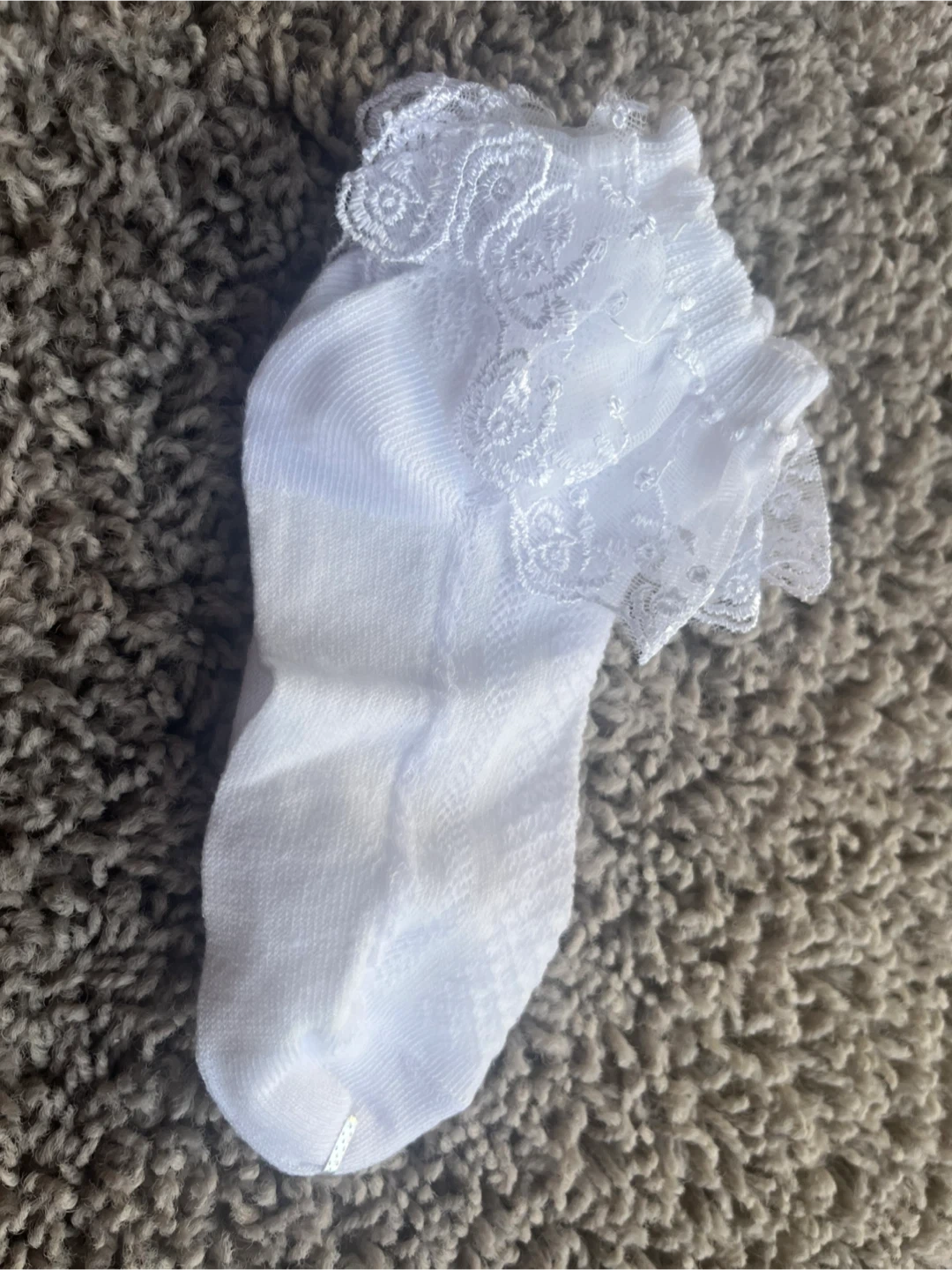 Adorable white ankle socks with a ruffled lace trim. These socks are soft and comfortable. They're perfect for dressing up an outfit!