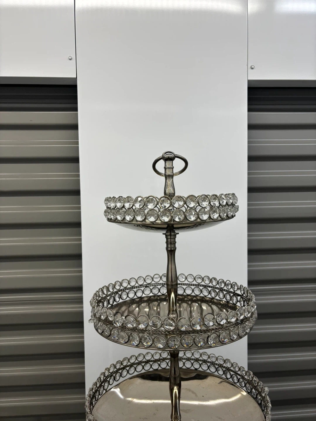 This elegant 3-tier serving stand features shimmering crystal embellishments on each tray. It's constructed from durable metal with a polished silver finish. This stand is perfect for displaying cupcakes, appetizers, or desserts at parties and special occasions!