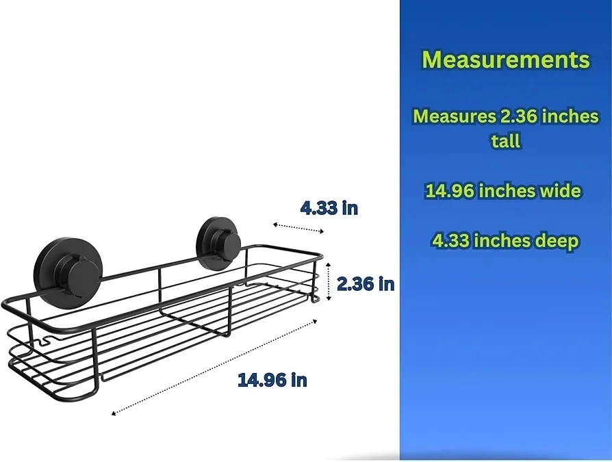 This suction cup shower caddy shelf is made from stainless steel for durability and rust resistance. It features easy installation with no tools or drilling needed, supporting up to 10 pounds. Its dimensions are 14.96 inches wide, 4.33 inches deep, and 2.36 inches tall. This is useful for organizing bathroom essentials.