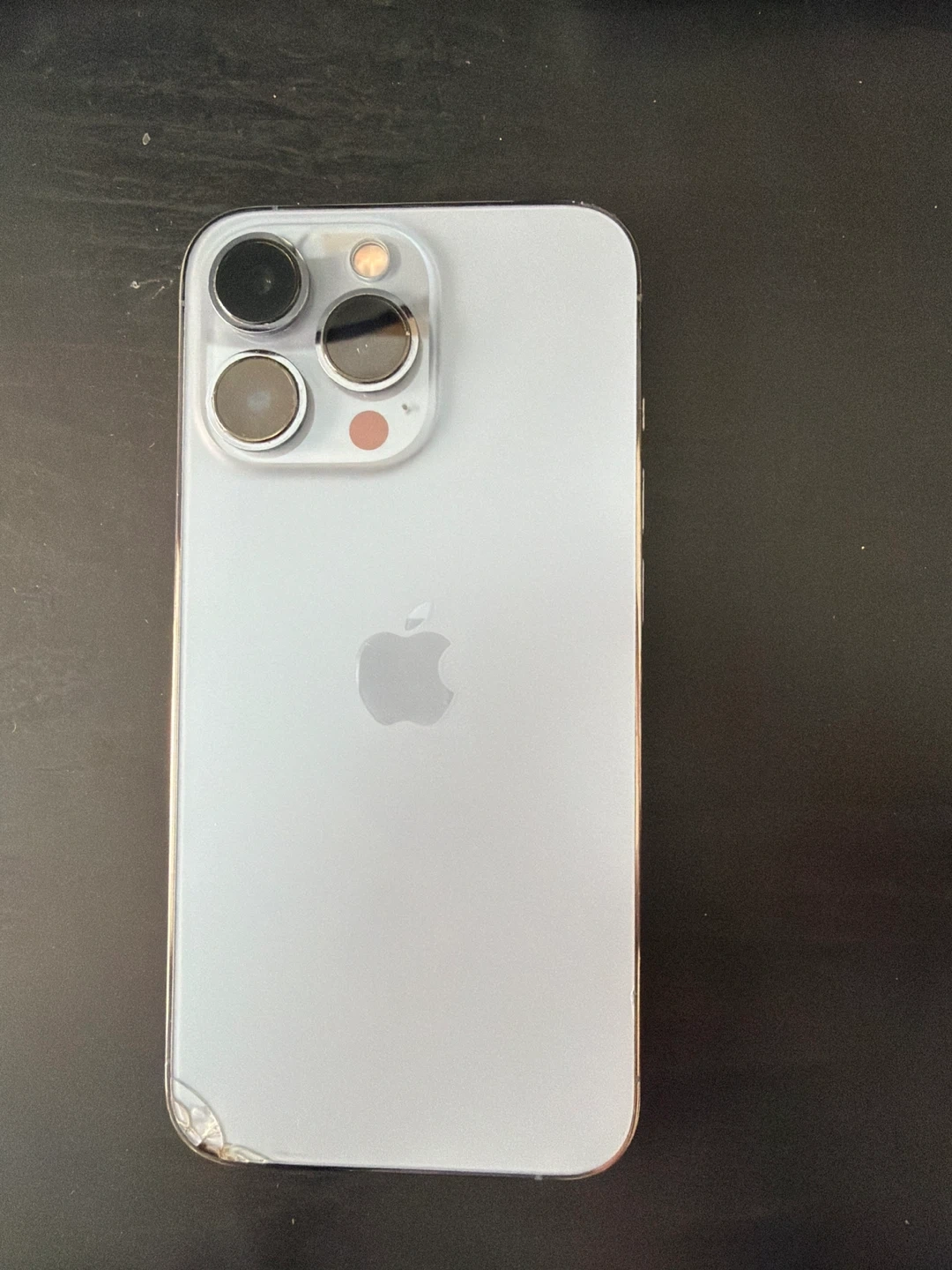 Used Apple iPhone 13 Pro in blue. The screen is cracked and there's a small chip on the bottom right corner of the back casing. Phone works functional